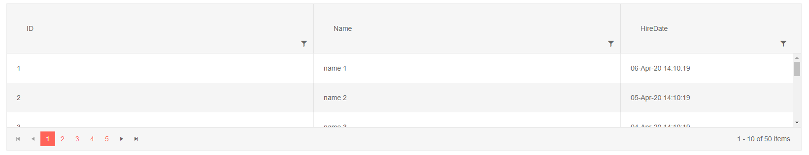 <style> .special-grid-paddings th.k-header { padding: 40px; } .special-grid-paddings .k-master-row td { padding: 20px; } </style> <TelerikGrid Class="special-grid-paddings" Data="@MyData" Height="300px" Pageable="true" Sortable="true" FilterMode="@GridFilterMode.FilterMenu"> <GridColumns> <GridColumn Field="@(nameof(SampleData.ID))"> </GridColumn> <GridColumn Field="@(nameof(SampleData.Name))"> </GridColumn> <GridColumn Field="HireDate" Width="350px"> </GridColumn> </GridColumns> </TelerikGrid> @code { public class SampleData { public int ID { get; set; } public string Name { get; set; } public DateTime HireDate { get; set; } } public IEnumerable<SampleData> MyData = Enumerable.Range(1, 50).Select(x => new SampleData { ID = x, Name = "name " + x, HireDate = DateTime.Now.AddDays(-x) }); }