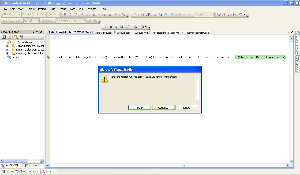 <telerik:RadScheduler runat="server" ID="RadScheduler1" OnClientFormCreated="schedulerFormCreated" Width="750px" SelectedDate="2009-03-30" TimeZoneOffset="03:00:00" CustomAttributeNames="Description,Continent,Country" OnDataBound="RadScheduler1_DataBound" OnAppointmentDataBound="RadScheduler1_AppointmentDataBound" DataEndField="End" DataKeyField="ID" DataRecurrenceField="RecurrenceRule" DataRecurrenceParentKeyField="RecurrenceParentID" DataStartField="Start" DataSubjectField="Subject" HoursPanelTimeFormat="htt" ValidationGroup="RadScheduler1" DataSourceID="SqlDataSource1"> <AdvancedForm Modal="true" /> <AdvancedEditTemplate> <scheduler:AdvancedForm runat="server" ID="AdvancedEditForm1" Mode="Edit" Subject='<%# Bind("Subject") %>' Start='<%# Bind("Start") %>' End='<%# Bind("End") %>' RecurrenceRuleText='<%# Bind("RecurrenceRule") %>' Continent='<%# Bind("Continent") %>' Country='<%# Bind("Country") %>'/> </AdvancedEditTemplate> <AdvancedInsertTemplate> <scheduler:AdvancedForm runat="server" ID="AdvancedInsertForm1" Mode="Insert" Subject='<%# Bind("Subject") %>' Start='<%# Bind("Start") %>' End='<%# Bind("End") %>' RecurrenceRuleText='<%# Bind("RecurrenceRule") %>' Continent='<%# Bind("Continent") %>' Country='<%# Bind("Country") %>' /> </AdvancedInsertTemplate> </telerik:RadScheduler> <asp:SqlDataSource ID="SqlDataSource1" runat="server" ConnectionString="<%$ ConnectionStrings:ReportoDBConnectionString %>" DeleteCommand="DELETE FROM [Appointment] WHERE [ID] = @ID" InsertCommand="INSERT INTO [Appointment] ([Subject], [Start], [End], [UserID], [RoomID], [RecurrenceRule], [RecurrenceParentID], [Description], [Continent], [Country]) VALUES (@Subject, @Start, @End, @UserID, @RoomID, @RecurrenceRule, @RecurrenceParentID, @Description, @Continent, @Country)" SelectCommand="SELECT * FROM [Appointment]" UpdateCommand="UPDATE [Appointment] SET [Subject] = @Subject, [Start] = @Start, [End] = @End, [UserID] = @UserID, [RoomID] = @RoomID, [RecurrenceRule] = @RecurrenceRule, [RecurrenceParentID] = @RecurrenceParentID, [Description] = @Description, [Continent] = @Continent, [Country] = @Country WHERE [ID] = @ID"> <DeleteParameters> <asp:Parameter Name="ID" Type="Int32" /> </DeleteParameters> <UpdateParameters> <asp:Parameter Name="Subject" Type="String" /> <asp:Parameter Name="Start" Type="DateTime" /> <asp:Parameter Name="End" Type="DateTime" /> <asp:Parameter Name="UserID" Type="Int32" /> <asp:Parameter Name="RoomID" Type="Int32" /> <asp:Parameter Name="RecurrenceRule" Type="String" /> <asp:Parameter Name="RecurrenceParentID" Type="Int32" /> <asp:Parameter Name="Description" Type="String" /> <asp:Parameter Name="Continent" Type="String" /> <asp:Parameter Name="Country" Type="String" /> <asp:Parameter Name="ID" Type="Int32" /> </UpdateParameters> <InsertParameters> <asp:Parameter Name="Subject" Type="String" /> <asp:Parameter Name="Start" Type="DateTime" /> <asp:Parameter Name="End" Type="DateTime" /> <asp:Parameter Name="UserID" Type="Int32" /> <asp:Parameter Name="RoomID" Type="Int32" /> <asp:Parameter Name="RecurrenceRule" Type="String" /> <asp:Parameter Name="RecurrenceParentID" Type="Int32" /> <asp:Parameter Name="Description" Type="String" /> <asp:Parameter Name="Continent" Type="String" /> <asp:Parameter Name="Country" Type="String" /> </InsertParameters> </asp:SqlDataSource>Please provide some help me..