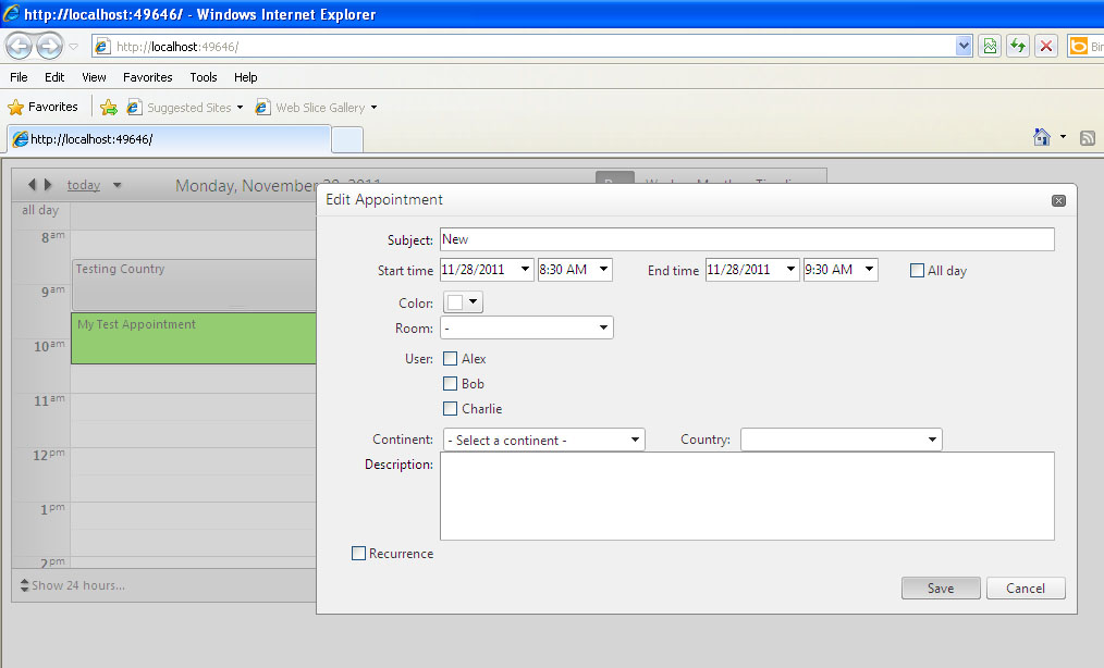 7. And when i make New appointment this is saving my data into XML File (without Country and Content) , but not changing in my DB as there is select insert update are in Dafult.aspx so this should save in DB but no data is inserted in table.