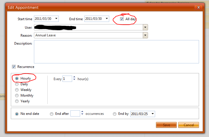 If they deselect "All Day" it must show the "Hourly" option again if it is a recurring appointment.