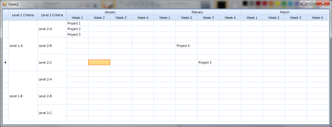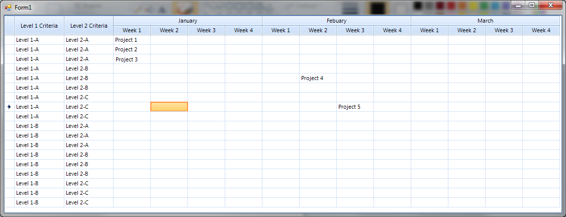 using System;using System.Collections.Generic;using System.Data;using System.Windows.Forms;using Telerik.WinControls.UI;namespace WindowsFormsApplication3{ public class Form1 : Form { private const string WeekDisplayedName = "Week"; private RadGridView Grid { get { return this.radGridView1; } } private struct ColsGrid { public const string Level1 = "Level 1 Criteria"; public const string Level2 = "Level 2 Criteria"; public const string FakeLevel = "Fake row"; } public Form1() { InitializeComponent(); InitializeGrid(); } /// <summary> /// /// </summary> private void InitializeGrid() { this.Grid.ShowFilteringRow = false; this.Grid.ShowGroupPanel = false; this.Grid.SelectionMode = GridViewSelectionMode.CellSelect; this.Grid.AllowAddNewRow = this.Grid.AllowDeleteRow = false; // Data var table = new DataTable(); table.Columns.Add(ColsGrid.Level1, typeof(string)); table.Columns.Add(ColsGrid.Level2, typeof(string)); table.Columns.Add(ColsGrid.FakeLevel, typeof(string)); var lst = new List<Tuple<string, string>>(); lst.Add(new Tuple<string, string>("Level 1-A", "Level 2-A")); lst.Add(new Tuple<string, string>("Level 1-A", "Level 2-B")); lst.Add(new Tuple<string, string>("Level 1-A", "Level 2-C")); lst.Add(new Tuple<string, string>("Level 1-B", "Level 2-A")); lst.Add(new Tuple<string, string>("Level 1-B", "Level 2-B")); lst.Add(new Tuple<string, string>("Level 1-B", "Level 2-C")); this.Grid.AutoExpandGroups = true; this.Grid.DataSource = table; //this.Grid.GroupDescriptors.Add(new GroupDescriptor("Project")); this.Grid.Columns.Add(new GridViewTextBoxColumn(ColsGrid.Level1)); this.Grid.Columns.Add(new GridViewTextBoxColumn(ColsGrid.Level2)); this.Grid.Columns.Add(new GridViewTextBoxColumn(ColsGrid.FakeLevel)); this.Grid.Columns[ColsGrid.Level1].Width = 100; this.Grid.Columns[ColsGrid.Level2].Width = 100; this.Grid.Columns[ColsGrid.FakeLevel].IsVisible = false; // Create fake lines for each level1/level2 int nbLines = 3; foreach (var item in lst) { for (var i = 0; i < nbLines; i++) { table.Rows.Add(item.Item1, item.Item2, i); } } // Add timeline columns string[] months = new string[] { "January", "Febuary", "March", }; for (int i = 0; i < months.Length; i++) { for (int j = 1; j <= 4; j++) { GridViewTextBoxColumn column = new GridViewTextBoxColumn(months[i] + WeekDisplayedName + j); column.HeaderText = WeekDisplayedName + " " + j.ToString(); column.Width = 75; this.Grid.Columns.Add(column); } } // Group the 3 first columns var def = new ColumnGroupsViewDefinition(); var colGroup = new GridViewColumnGroup("Row header group"); colGroup.ShowHeader = false; colGroup.Rows.Add(new GridViewColumnGroupRow()); colGroup.Rows[0].Columns.Add(this.Grid.Columns[ColsGrid.Level1]); colGroup.Rows[0].Columns.Add(this.Grid.Columns[ColsGrid.Level2]); colGroup.Rows[0].Columns.Add(this.Grid.Columns[ColsGrid.FakeLevel]); def.ColumnGroups.Add(colGroup); // Create a group for each month, each containing 4 weeks for (int i = 0; i < months.Length; i++) { def.ColumnGroups.Add(new GridViewColumnGroup(months[i])); def.ColumnGroups[1 + i].Rows.Add(new GridViewColumnGroupRow()); for (int j = 1; j <= 4; j++) { def.ColumnGroups[1 + i].Rows[0].Columns.Add(this.Grid.Columns[months[i] + WeekDisplayedName + j]); } } this.Grid.ViewDefinition = def; // Create fake data this.Grid.Rows[0].Cells[months[0] + WeekDisplayedName + "1"].Value = "Project 1"; this.Grid.Rows[1].Cells[months[0] + WeekDisplayedName + "1"].Value = "Project 2"; this.Grid.Rows[9].Cells[months[0] + WeekDisplayedName + "3"].Value = "Project 3"; this.Grid.Rows[4].Cells[months[1] + WeekDisplayedName + "2"].Value = "Project 4"; this.Grid.Rows[7].Cells[months[1] + WeekDisplayedName + "3"].Value = "Project 5"; } #region Designer stuff /// <summary> /// Variable nécessaire au concepteur. /// </summary> private System.ComponentModel.IContainer components = null; /// <summary> /// Nettoyage des ressources utilisées. /// </summary> /// <param name="disposing">true si les ressources managées doivent être supprimées ; sinon, false.</param> protected override void Dispose(bool disposing) { if (disposing && (components != null)) { components.Dispose(); } base.Dispose(disposing); } #region Code généré par le Concepteur Windows Form /// <summary> /// Méthode requise pour la prise en charge du concepteur - ne modifiez pas /// le contenu de cette méthode avec l'éditeur de code. /// </summary> private void InitializeComponent() { this.radGridView1 = new Telerik.WinControls.UI.RadGridView(); ((System.ComponentModel.ISupportInitialize)(this.radGridView1)).BeginInit(); this.SuspendLayout(); // // radGridView1 // this.radGridView1.Dock = System.Windows.Forms.DockStyle.Fill; this.radGridView1.Location = new System.Drawing.Point(0, 0); this.radGridView1.Name = "radGridView1"; this.radGridView1.Size = new System.Drawing.Size(1137, 629); this.radGridView1.TabIndex = 0; this.radGridView1.Text = "radGridView1"; // // Form1 // this.AutoScaleDimensions = new System.Drawing.SizeF(6F, 13F); this.AutoScaleMode = System.Windows.Forms.AutoScaleMode.Font; this.ClientSize = new System.Drawing.Size(1137, 629); this.Controls.Add(this.radGridView1); this.Name = "Form1"; this.Text = "Form1"; ((System.ComponentModel.ISupportInitialize)(this.radGridView1)).EndInit(); this.ResumeLayout(false); } #endregion private Telerik.WinControls.UI.RadGridView radGridView1; #endregion }}