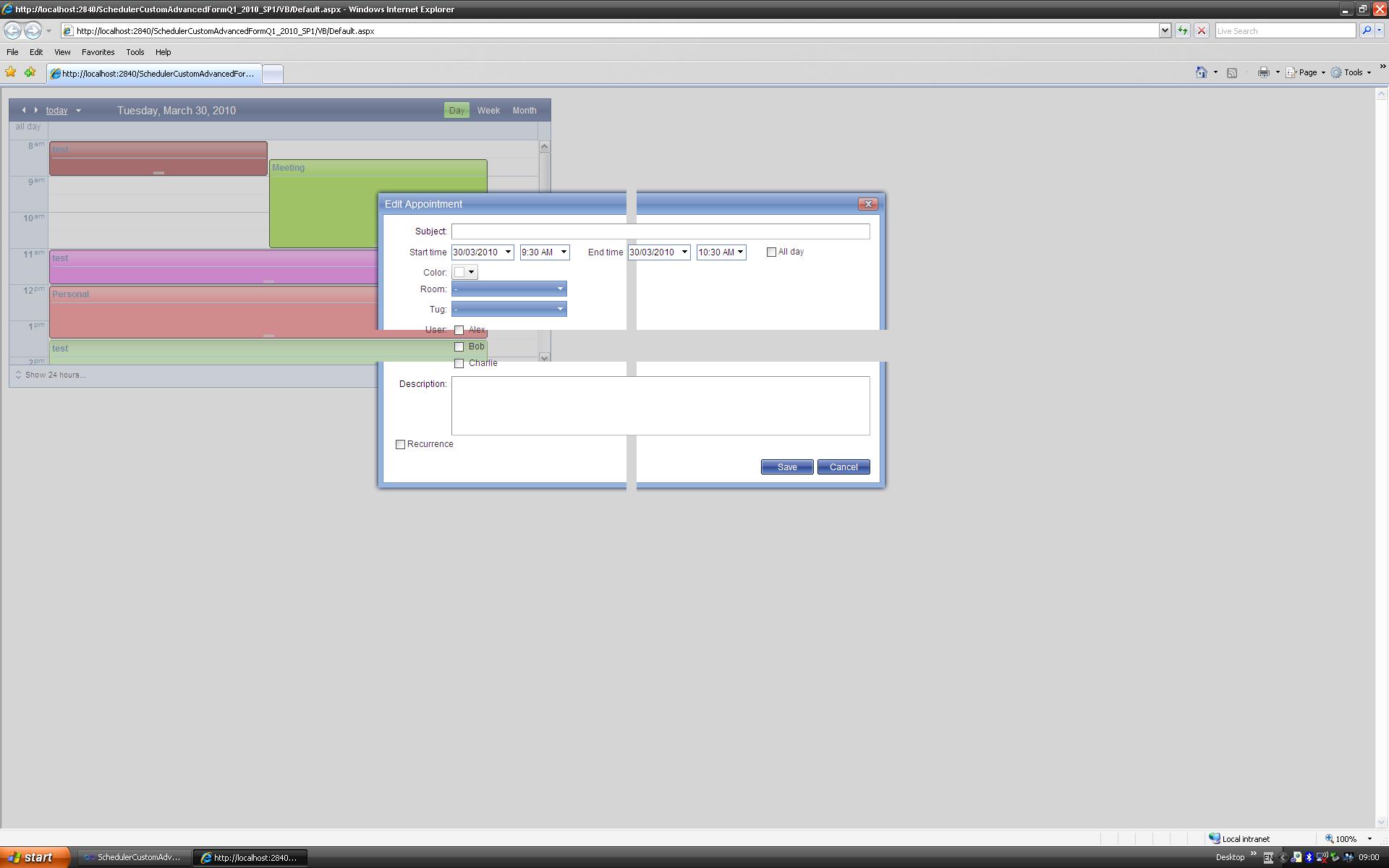 protected void Page_Load(object sender, EventArgs e) { UpdateButton.ValidationGroup = Owner.ValidationGroup; UpdateButton.CommandName = Mode == RadSchedulerAdvancedFormAdvancedFormMode.Edit ? "Update" : "Insert"; InitializeStrings(); InitializeRecurrenceEditor(); if (!FormInitialized) { UpdateResetExceptionsVisibility(); } RadComboBoxItem selectedItem = DurationComboBox.FindItemByValue(Appointment.Duration.TotalMinutes.ToString()); if (selectedItem != null) DurationComboBox.SelectedValue = Appointment.Duration.TotalMinutes.ToString(); else { RadComboBoxItem newItem = new RadComboBoxItem(Appointment.Duration.TotalHours.ToString() + " hours", Appointment.Duration.TotalMinutes.ToString()); DurationComboBox.Items.Insert(0, newItem); DurationComboBox.SelectedIndex = 0; } }AdvancedForm.js