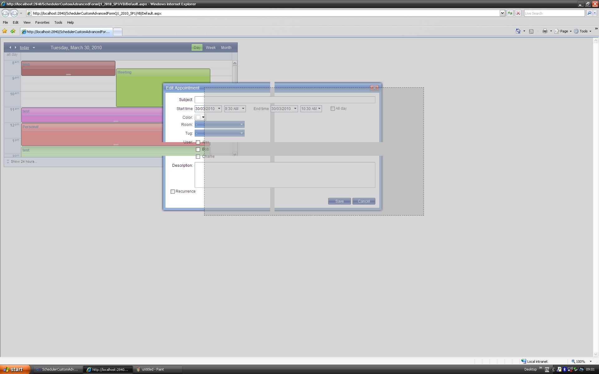 I created this using your SchedulerCustomAdvancedFormQ1_2010_SP1 example from the website, I have not made any modifications to the code.