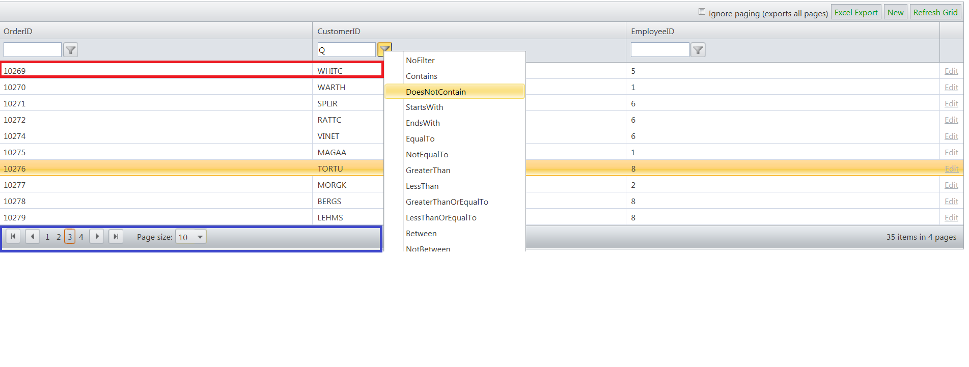 I would like immediately after Export, row with Order Id 10269 with CustomerID WHITC from current page ( (i.e. page# 2 of entire Grid) will be automatically selected.