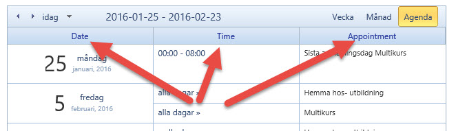 You can configure the target localization strings for the RadScheduler's Agenda headers through the HeaderAgendaDate, HeaderAgendaTime and HeaderAgendaAppointment properties of the Localization tag of the control in a similar way: