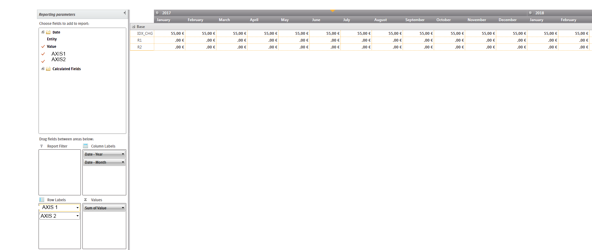 In my pivot grid I display the results that match my fields Axis 1 and Axis 2 for the different months of years 2017 and 2018. that's fine.
