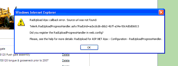 We have multiple telerik controls on a page and any time you click on the in IE 8 on a win xp machine we get the error attached. Do you know of any solution for this? I should note that the commands (such as a delete command in a gridview, an upload command, etc) actually work, it just pops up with that ajax error every time. Any ideas?
