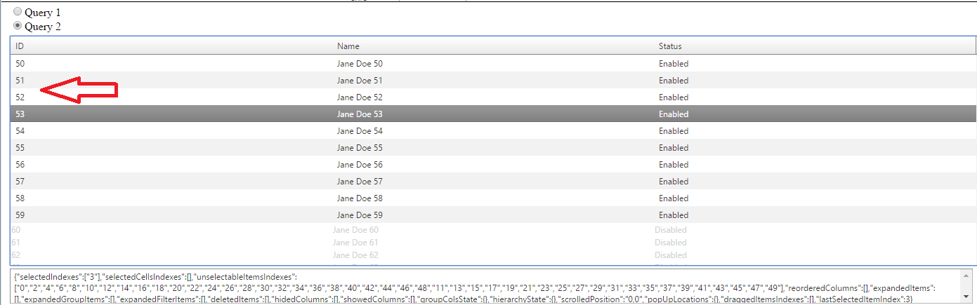 When you run this "Query 1" radio is selected. Click on a row. You will see the grid's ClientState in the text box. Look at the unselectableItemsIndexes. Now click on "Query 2". Try to select one of the first few rows. You will notice that despite them being enabled, you can't click on them. Now click on a row that works. Compare the unselectableItemsIndexes with the previous query. You will see that it is appending indexes.