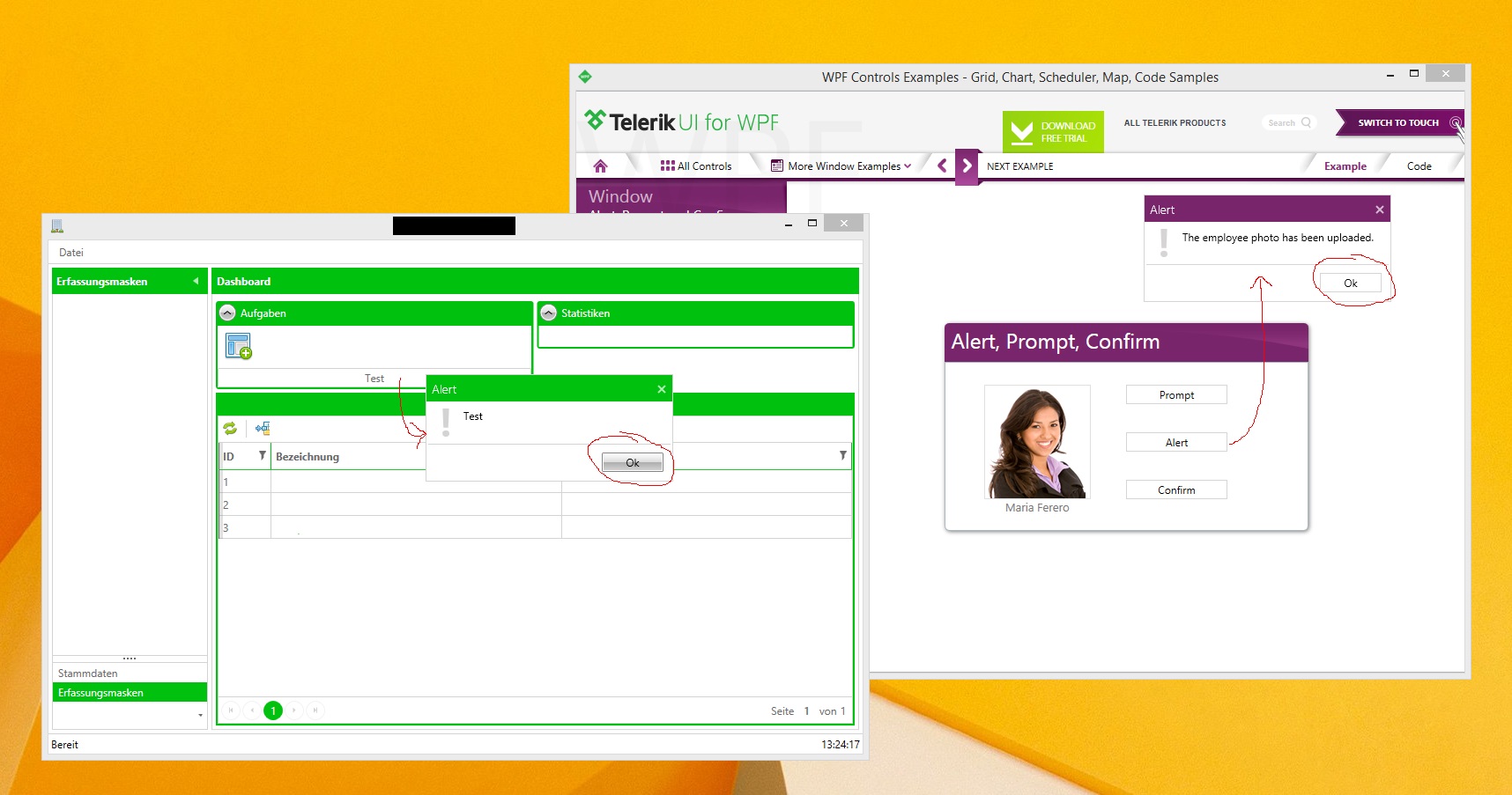I have a usual UserControl with a button. I just want so show a RadWindow.Alert. Here's the Code behind: