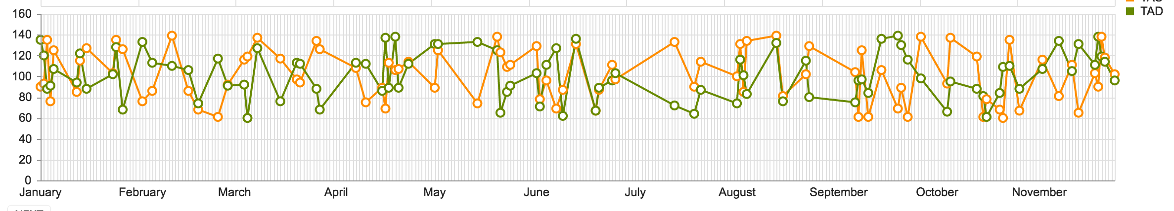 samples.forEach((s:any) => s.date = s.date.toDate()); this.panes.push({ clip: false, name: 'samples' }); this.categoryAxis.push({ name: 'samples', pane: 'samples', labels: { visible: true, template: "#= value.getDate() == 1 ? kendo.toString(value, 'MMMM') : '' #", step: 1 }, majorGridLines: { visible: true, //step: 30 }, majorTicks: { visible: false }, minorGridLines: { visible: false }, justified: true, baseUnit: 'days' }); this.valueAxis.push({ name: 'samples', pane: 'samples', visible: true }); let variables = Helpers.distinctInArray(samples, (i: MonitorSample) => i.variable); variables.forEach(v => { let filteredSamples = samples.filter(s => s.variable == v); this.series.push({ name: v, type: 'line', line: { style: 'smooth' }, field: 'value', categoryField: 'date', axis: 'samples', categoryAxis: 'samples', data: filteredSamples, tooltip: { visible: true, template: '#=value# #=category#' } }) });