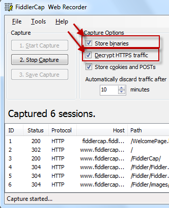 2. If direct access is not possible, capture a Fiddler trace and attach it to this support ticket in a zip file. If you are unfamiliar with how to do so, this link will provide you with step-by-step instructions for download and use. Please make sure to enable 'Decrypt HTTPS traffic' and 'Store binaries' options (see attached image) before starting capture.