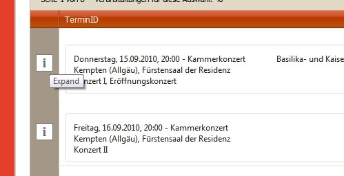 <telerik:RadGrid ID="RadGrid1" runat="server" Culture="de-DE" DataSourceID="SqlDataSourceGrid1" Skin="Sunset" GridLines="None" Width="630px"> <MasterTableView AutoGenerateColumns="False" DataKeyNames="TerminID" ClientDataKeyNames="TerminID" ShowHeader="false" AlternatingItemStyle-BackColor="#ffffff" DataSourceID="SqlDataSourceGrid1" AllowPaging="True" PageSize="5" NoMasterRecordsText="Für diese Auswahl sind leider keine Einträge vorhanden!" ExpandCollapseColumn-ButtonType="ImageButton" ExpandCollapseColumn-ExpandImageUrl="Images/info.gif" ExpandCollapseColumn-CollapseImageUrl="Images/collapse.gif" HierarchyDefaultExpanded="false" > <Columns> <telerik:GridBoundColumn DataField="TerminID" DataType="System.Int32" HeaderText="TerminID" ReadOnly="True" SortExpression="TerminID" UniqueName="TerminID"> </telerik:GridBoundColumn> </Columns> <ItemTemplate> <div style="width:580px;"> <div style="margin-top:20px;background:#ffffff;"></div> <fieldset style="padding: 10px;"> <div style="float:left;"><%# WeekdayName(Weekday(Eval("Datum")))%>, <%# Eval("Datum", "{0:dd.MM.yyyy}")%>, <%# DisplayTime(Eval("Uhrzeit"))%> - <%# Eval("TypName")%></div> <div style="float:right;"><%# Eval("Festival")%></div> <div style="clear:both"><%# Eval("Ortsname")%>, <%# Eval("LocationName")%></div> <div style="clear:both"><%# Eval("Titel")%></div> <div style="clear:both"><%# Eval("Untertitel")%></div> </fieldset> </div> </ItemTemplate> <DetailTables> <telerik:GridTableView DataKeyNames="TerminID" ShowHeader="false" DataSourceID="SqlDataSource2" CssClass="Programm" runat="server" GridLines="None" BorderColor="#ffffff" > <ParentTableRelation> <telerik:GridRelationFields DetailKeyField="TerminID" MasterKeyField="TerminID" /> </ParentTableRelation> <ItemTemplate> <div style="width:90%;"> <fieldset style="margin-left:5px;padding:10px;"> <legend style="padding: 5px;font-weight:bold;font-size:12px;">Programmdetails zu <%# Eval("Titel")%></legend> <div><%# Replace(Eval("Programm"), vbCrLf, "<br/>")%></div> <div style="text-align:right;"><%# MakeLink(Eval("Web")) %></div> </fieldset> </div> </ItemTemplate> </telerik:GridTableView> </DetailTables> <PagerStyle Mode="NextPrev" Position="TopAndBottom" /> </MasterTableView> </telerik:RadGrid>I have followed your scenario and prepared a sample project for you demonstrating how the desired functionality can be implemented. You can find it attached to this message.