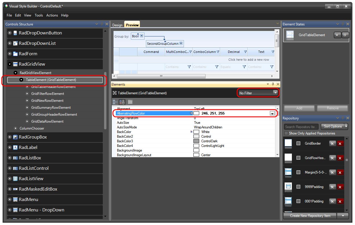 Ahhh, that was it, THANKS! For me the reason I could not find it was that little filter drop down you pointed out. It kept hiding it in the style designer. Just as general feedback, I would propose that in the future that you add a new control structure (left pane under TableElement).... something like GridAlternatingRowElement or similar so that this is much easier to find and edit. This would also allow you to use a repository item.