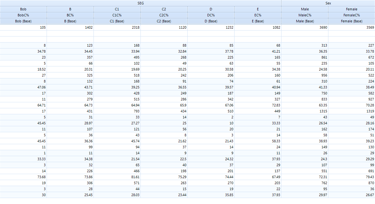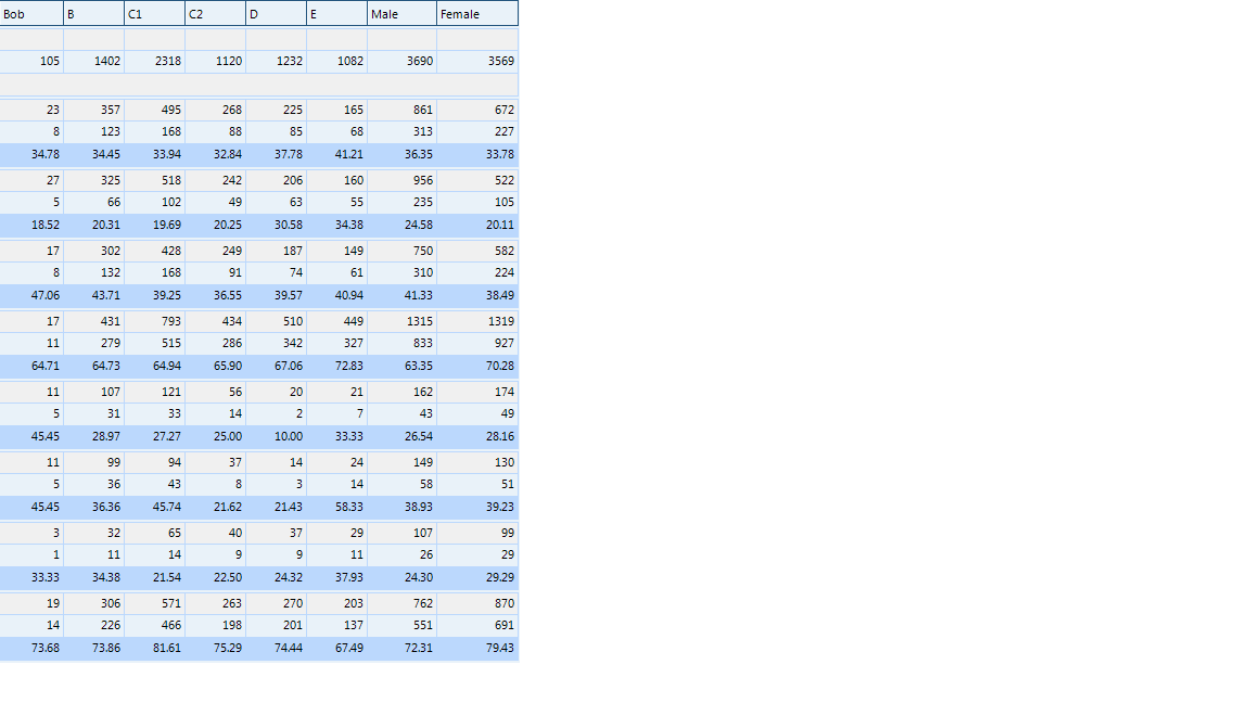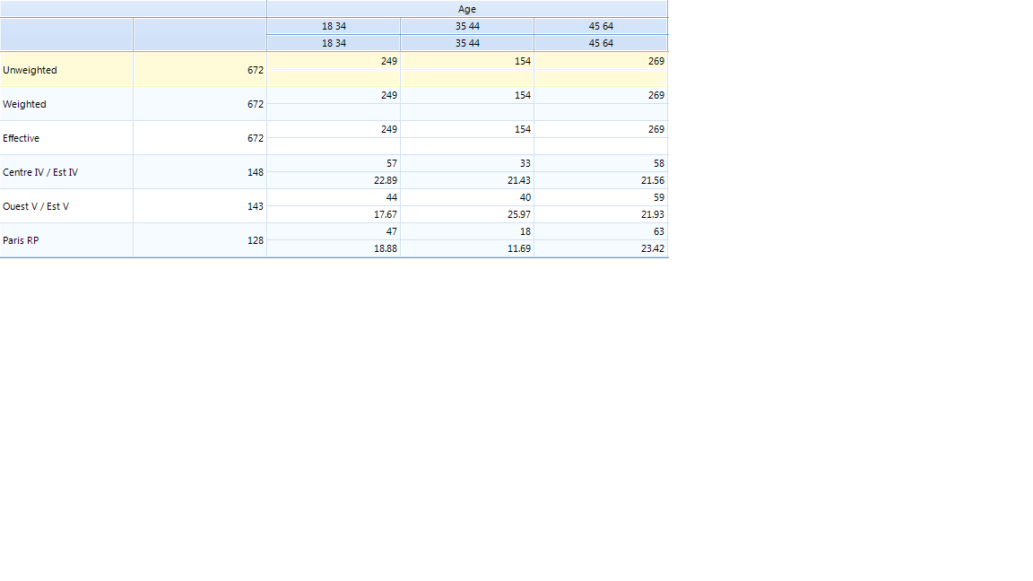 Sorry for the late reply... If you see the screenshot, there are 2 values for the age columns. For eg - Paris RP has 47 and 18.88 for 18-34; 18 and 11.69 for the next and 63 and 23.42 for the other. I want the rows containg 47, 18 and 63 to be one color and the row containing 18.88, 11.69 and 23.42 in another. The scheme being applied through out the grid