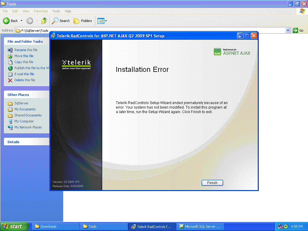 I am trying to install Q2 2009 sp1 version of ASP.NET Rad controls but at the end of installation I am getting following error: