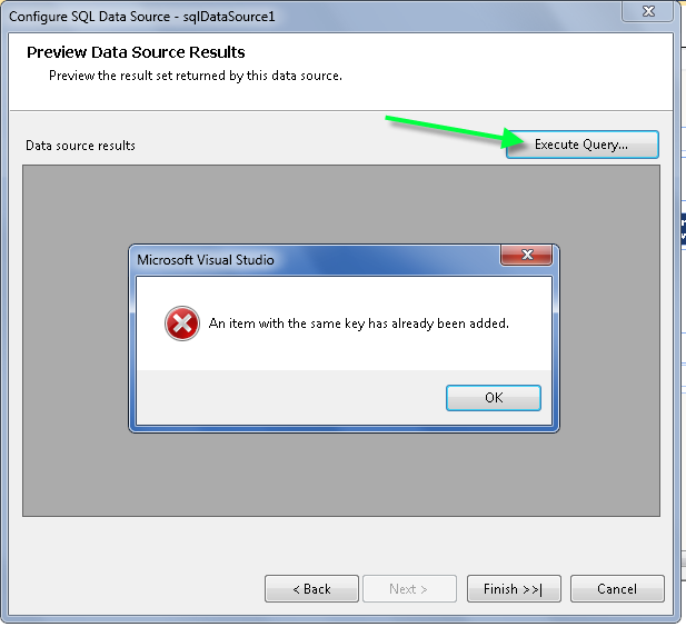 At first I thought there was an issue with duplicate field names, etc. However, this didn't really make sense as their definitions are "private". After deleting fields, etc and getting no where, I ended determining the the issue is related to the sql query string. When I go to configure the datasource using the wizard, I enter the query string and when I attempt to click "Execute Query" this error display. In this query I am selecting similar column names from the database. I renamed the datasource name property and still no luck. Why would my query cause this? I have listed them below. BTW... both queries execute fine in SQL Server Management Studio.