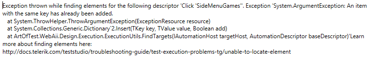 Exception thrown while finding elements for the following descriptor 'Verify element 'DepositIcon' 'is' visible.'. Exception 'System.ArgumentException: An item with the same key has already been added.