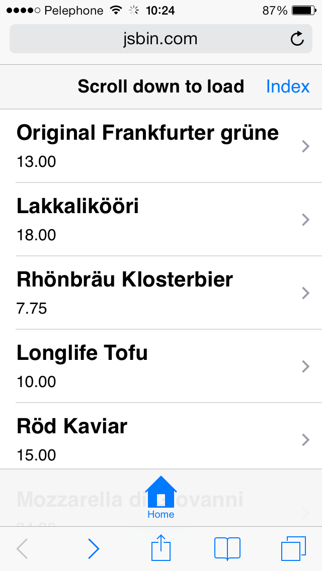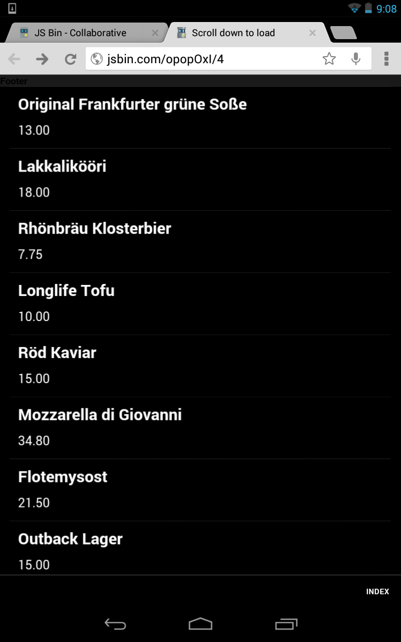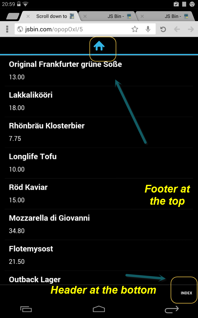 in the following example, clicking the list item leads to a detail page. Header and footer are present. I tested it on Android 4.1.2 device (Nexus), it seemed to work as expected. Obviously, I am missing something. Can you please modify the jsbin, so that we can re-create the problem on our side? Thank you in advance.