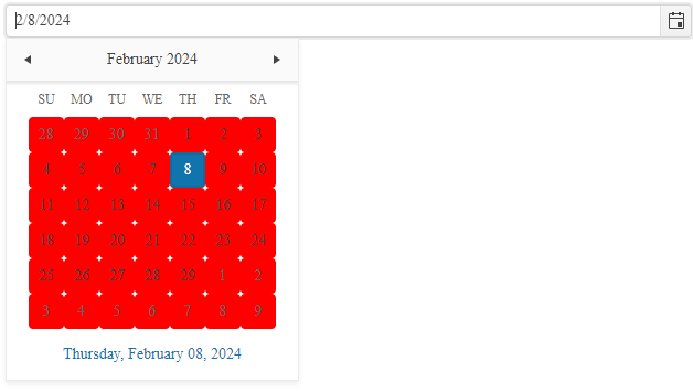 content: (data) => `<span class="${(data.date.getDate() == 9 && data.date.getMonth() == 2 && data.date.getFullYear() == 2024) ? 'color' : ''}">${data.value}</span>`