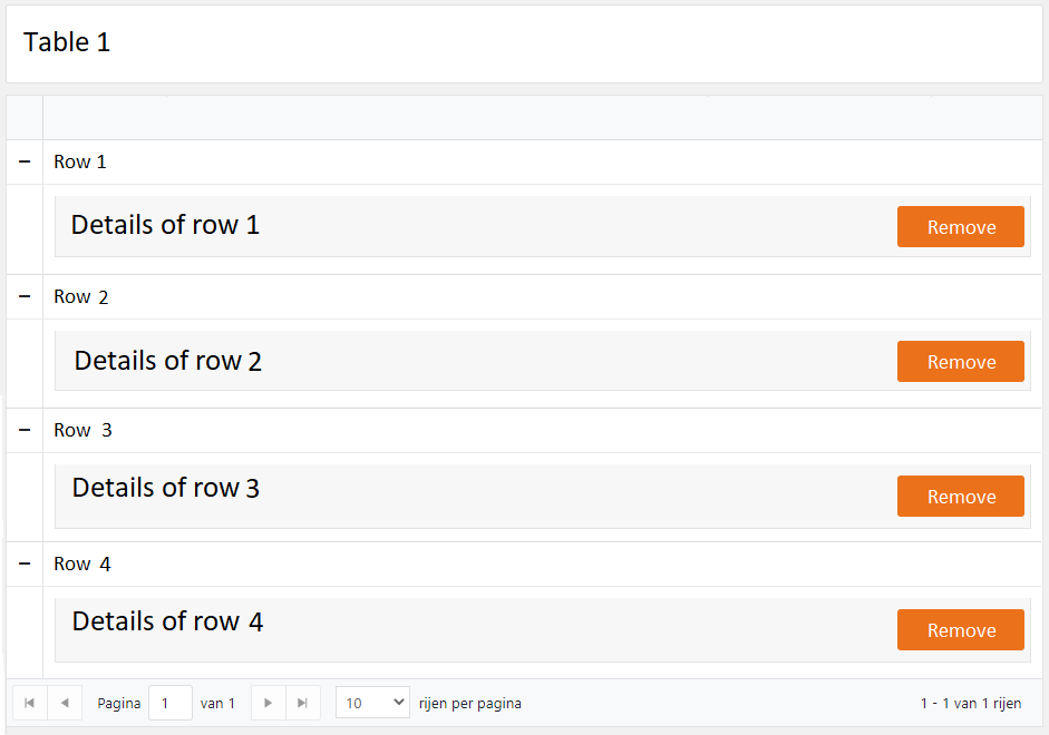 onDelete(deletedRowId: number): void { this.rows = this.rows.filter(r => r.id !== deletedRowId.id); this.loadGridResult();}loadGridResult(): void { this.gridSettings.gridView = { data: orderBy(this.rows, this.gridSettings.sort) .slice(this.gridSettings.skip, this.gridSettings.skip + this.gridSettings.pageSize), total: this.rows.length };}On screen the row is removed from the table and the next row is expanded (I asume this happens since the row with this index used to be expanded), but the details for the already removed row are still shown. This means that now the table shows a row with incorrect details. The shown details do not belong to this row. I don't think this should ever happen!
