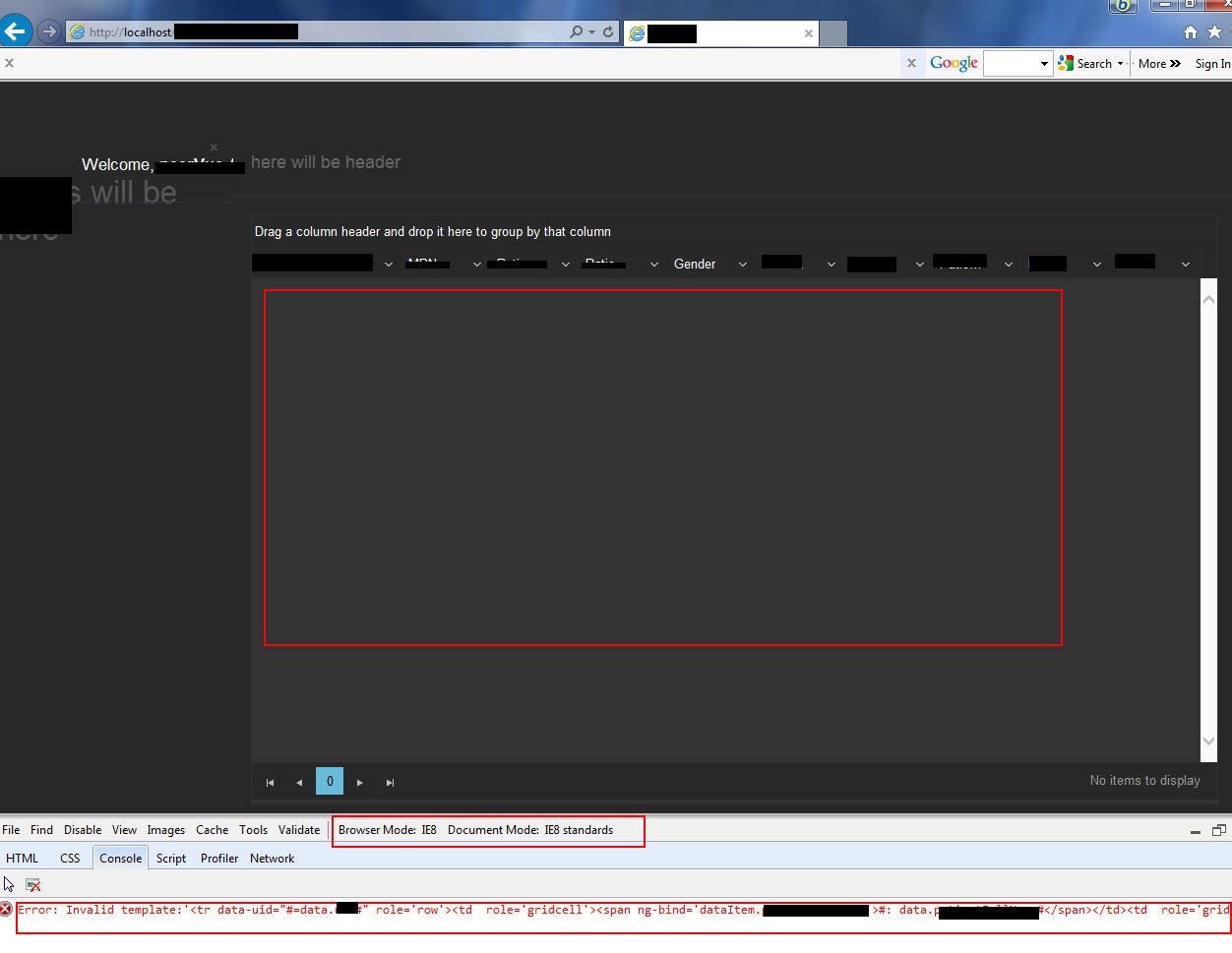 and the grid is not appear once I test it with IE8 (screenshot attached 2.jpg) Error in console: