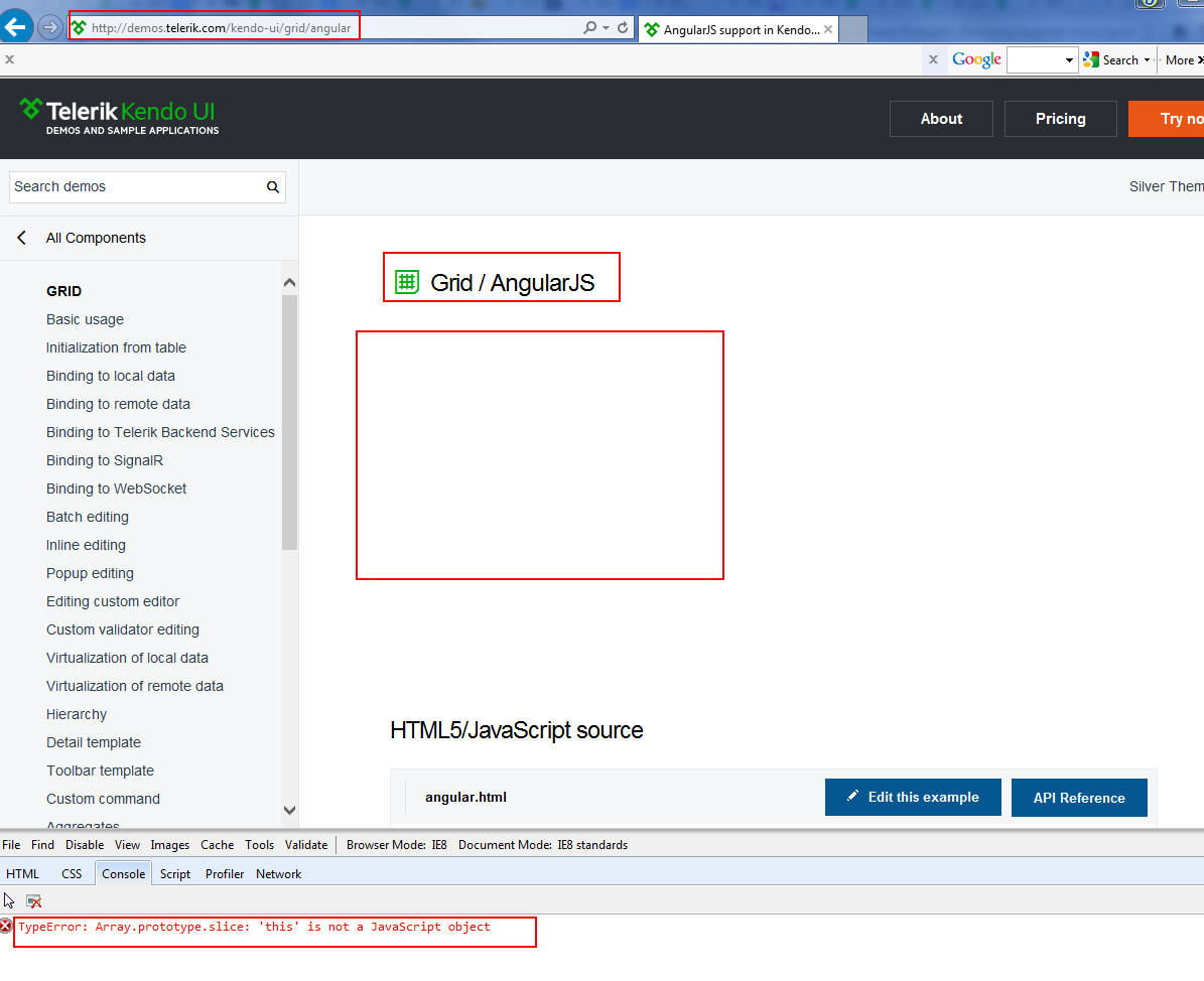 I also try to test your own example of Kendo & AngularJS: 'http://demos.telerik.com/kendo-ui/grid/angular'