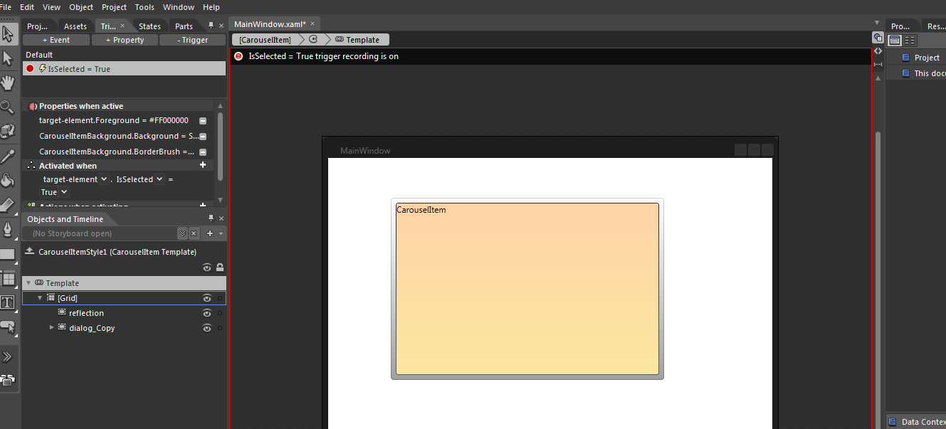 <ControlTemplate.Triggers> <Trigger Property="IsSelected" Value="True"> <Setter Property="Background" TargetName="CarouselItemBackground"> <Setter.Value> <LinearGradientBrush EndPoint="0.5,1" StartPoint="0.5,0"> <GradientStop Color="#FFFCE79F" Offset="1"/> <GradientStop Color="#FFFDD3A8"/> </LinearGradientBrush> </Setter.Value> </Setter> <Setter Property="BorderBrush" TargetName="CarouselItemBackground"> <Setter.Value> <LinearGradientBrush EndPoint="0.5,1" StartPoint="0.5,0"> <GradientStop Color="#FF282828"/> <GradientStop Color="#FF5F5F5F" Offset="1"/> </LinearGradientBrush> </Setter.Value> </Setter> <Setter Property="Foreground" Value="Black"/> <Setter Property="RenderTransform" TargetName="grid"> <Setter.Value> <TransformGroup> <ScaleTransform/> <SkewTransform/> <RotateTransform Angle="-45"/> <TranslateTransform/> </TransformGroup> </Setter.Value> </Setter> </Trigger> </ControlTemplate.Triggers> </ControlTemplate>Feel free to modify this snippet in the way you need.