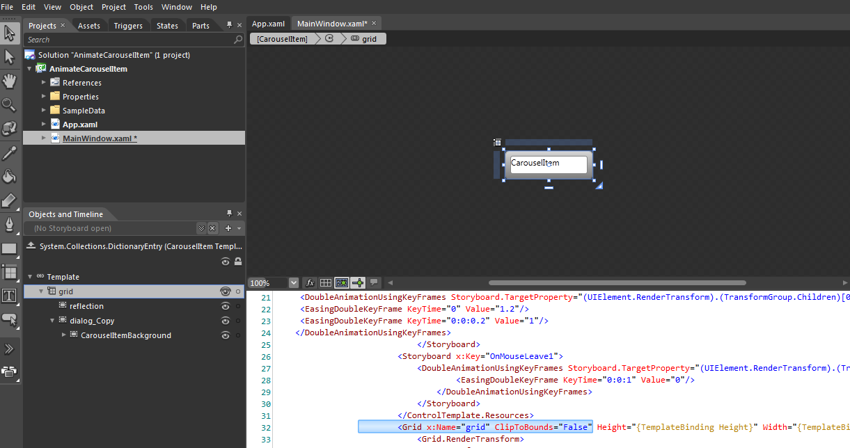 <Storyboard x:Key="OnMouseEnter1"> <DoubleAnimationUsingKeyFrames Storyboard.TargetProperty="(UIElement.RenderTransform).(TransformGroup.Children)[0].(ScaleTransform.ScaleX)" Storyboard.TargetName="grid"> <EasingDoubleKeyFrame KeyTime="0" Value="1.2"/> <EasingDoubleKeyFrame KeyTime="0:0:0.2" Value="1"/></DoubleAnimationUsingKeyFrames> <DoubleAnimationUsingKeyFrames Storyboard.TargetProperty="(UIElement.RenderTransform).(TransformGroup.Children)[0].(ScaleTransform.ScaleY)" Storyboard.TargetName="grid"> <EasingDoubleKeyFrame KeyTime="0" Value="1.2"/> <EasingDoubleKeyFrame KeyTime="0:0:0.2" Value="1"/></DoubleAnimationUsingKeyFrames> </Storyboard> <Storyboard x:Key="OnMouseLeave1"> <DoubleAnimationUsingKeyFrames Storyboard.TargetProperty="(UIElement.RenderTransform).(TransformGroup.Children)[2].(RotateTransform.Angle)" Storyboard.TargetName="grid"> <EasingDoubleKeyFrame KeyTime="0:0:1" Value="0"/> </DoubleAnimationUsingKeyFrames>In this case the grid is the primary container of the CarouselItem, you may refer to the Expression Blend preview from the attached picture. Furthermore I am attaching you sample application which demonstrates how to implement MouseEnter/MouseLeave animations in CarouselItem using a single implicit style.