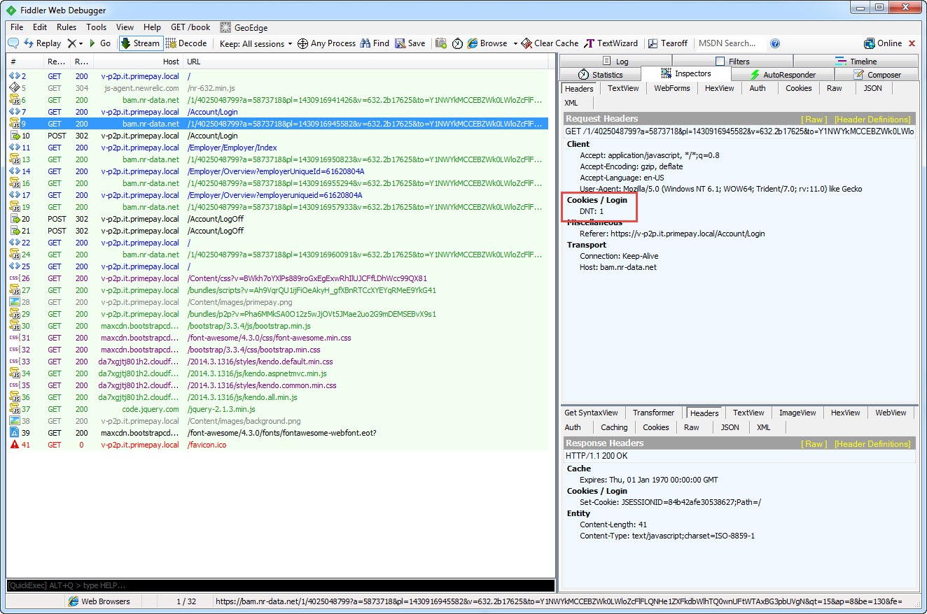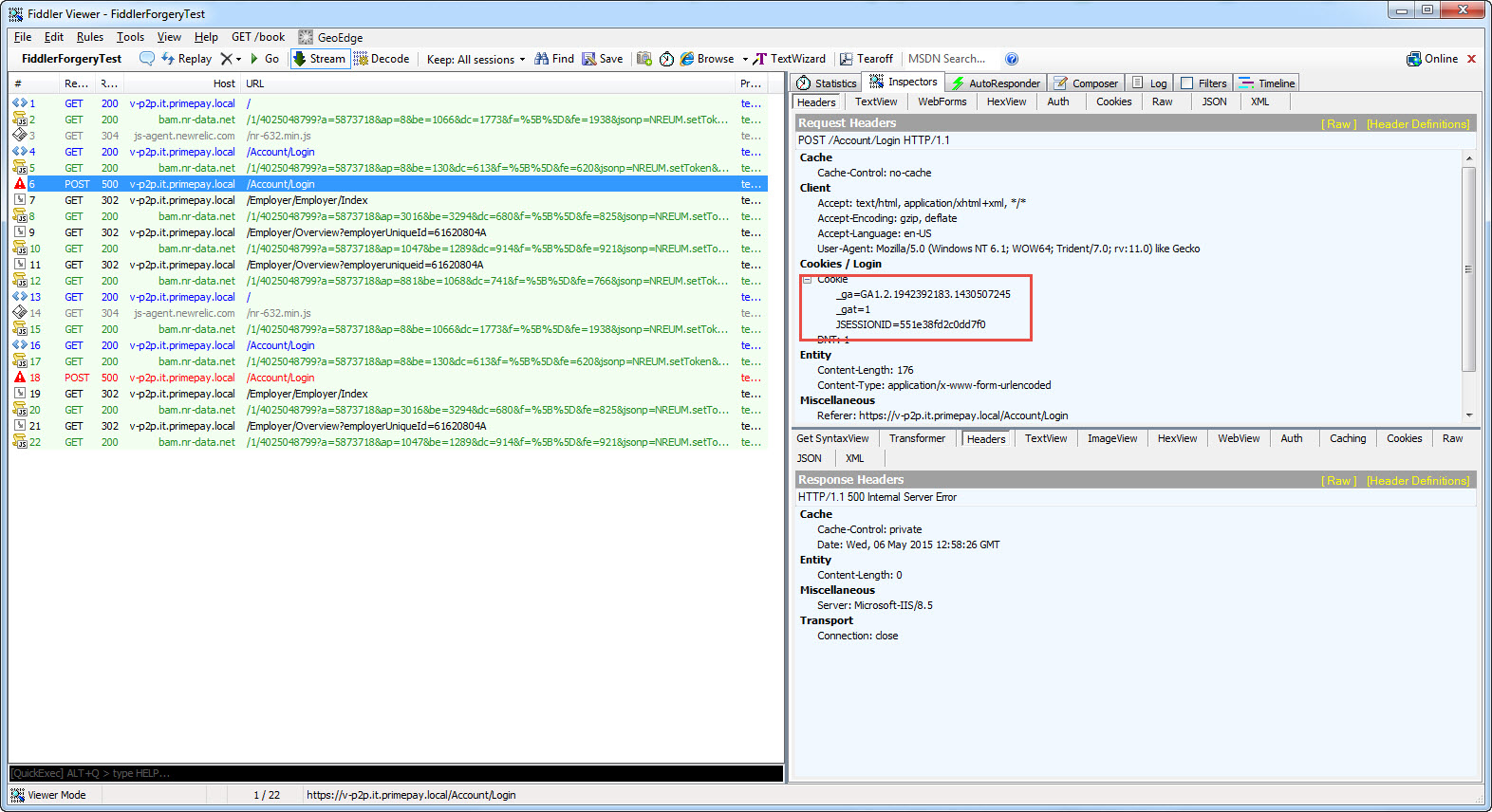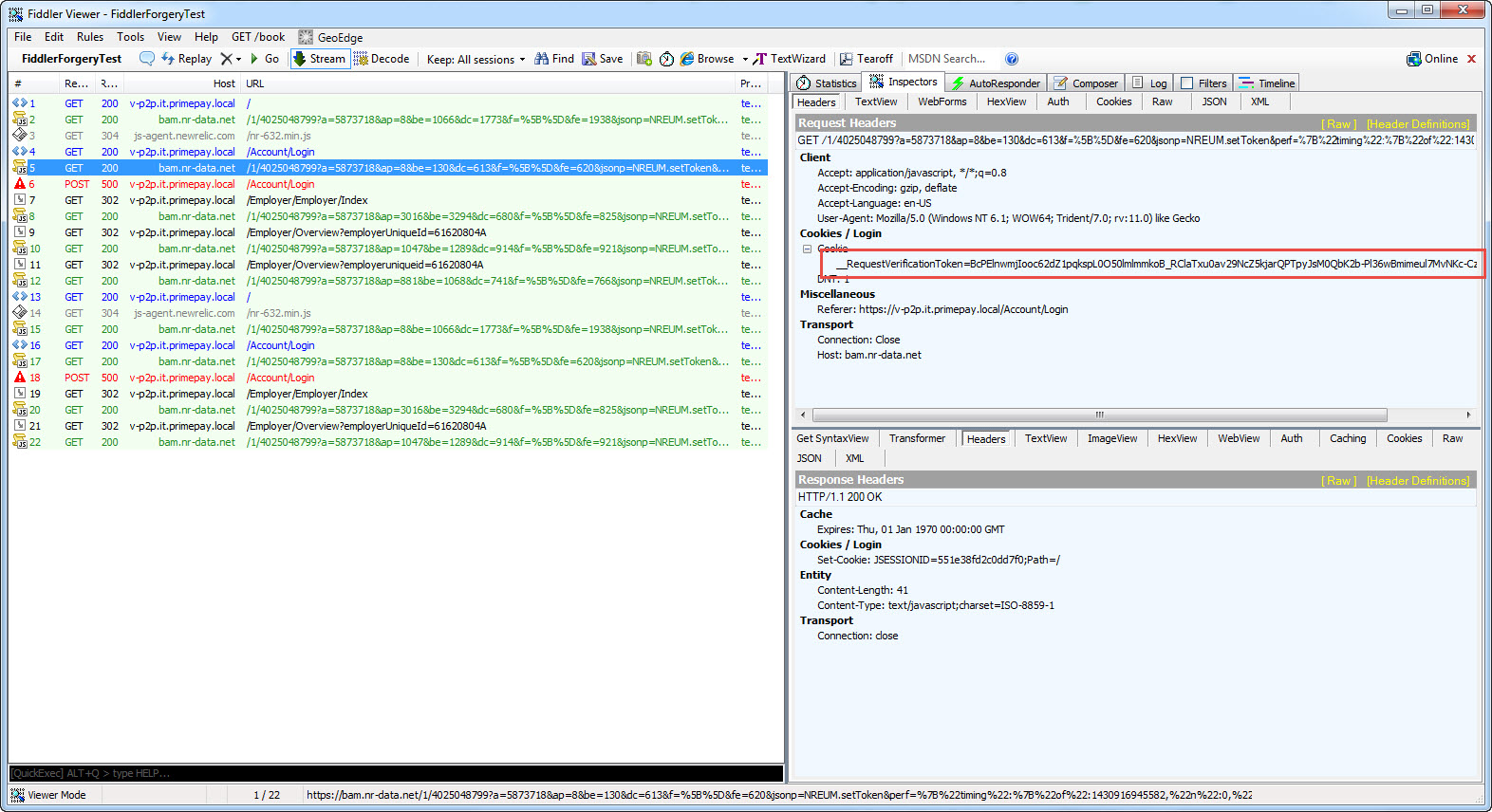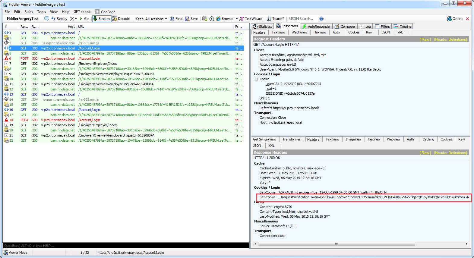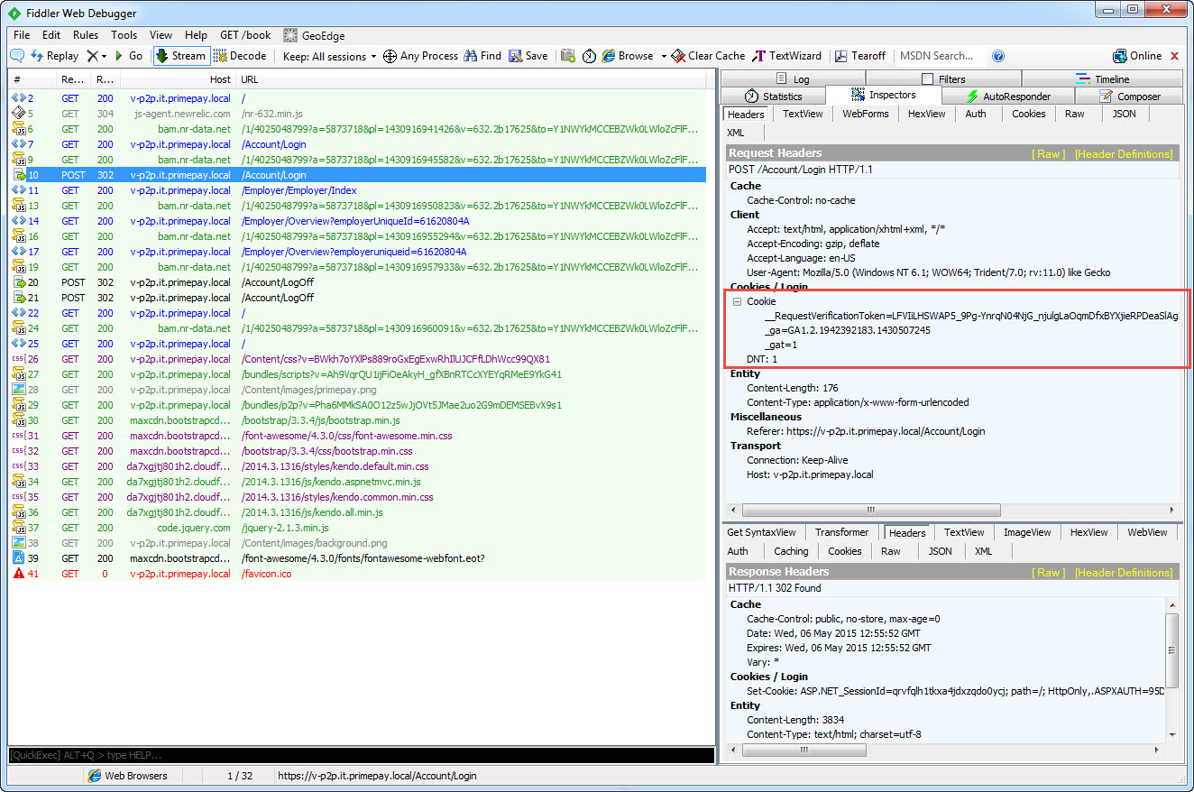 - In the next screen shot we can see the correct Login post with the correct __RequestVerificationToken cookie
