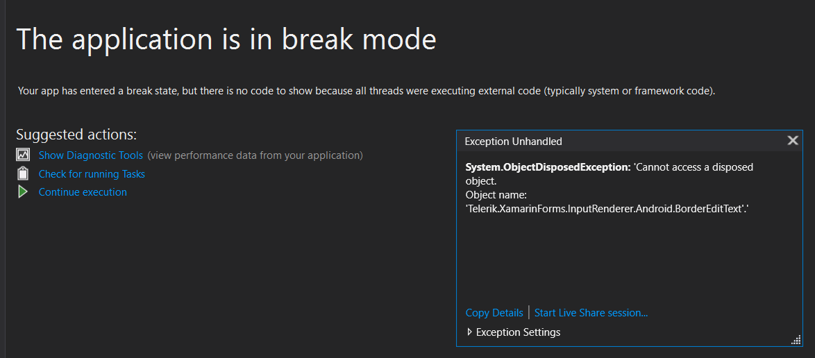 When I click on 2tab and without the 2nd tab being appeared properly when I click on 1st tab, the app is getting crashed saying System.ObjectDisposedException: 'Cannot access a disposed object. Object name: 'Telerik.XamarinForms.InputRenderer.Android.BorderEditText'.'