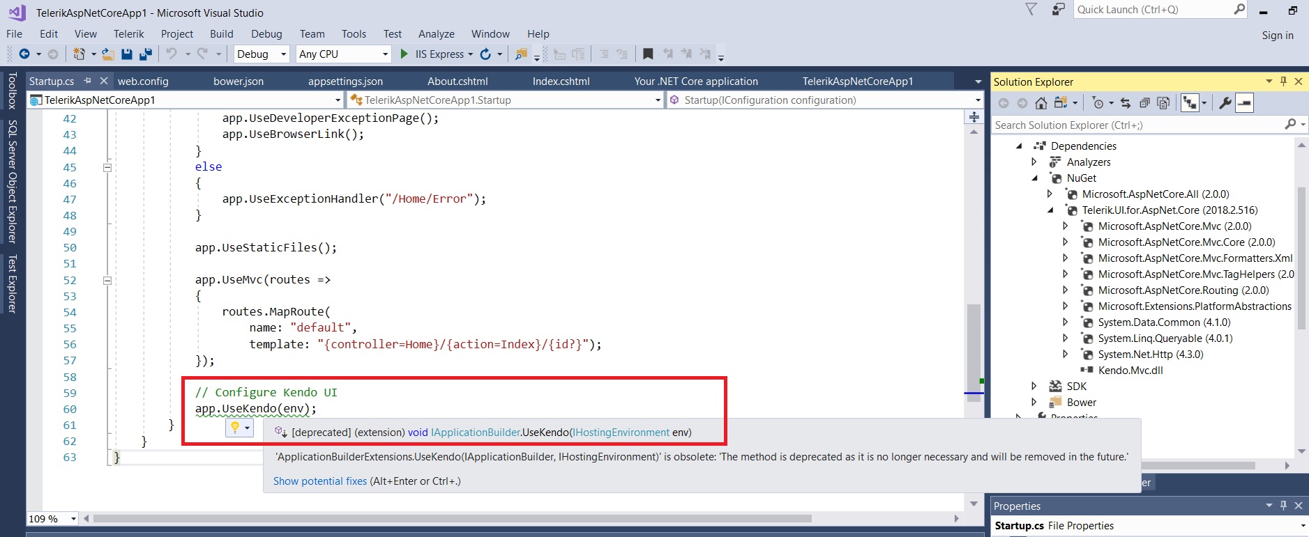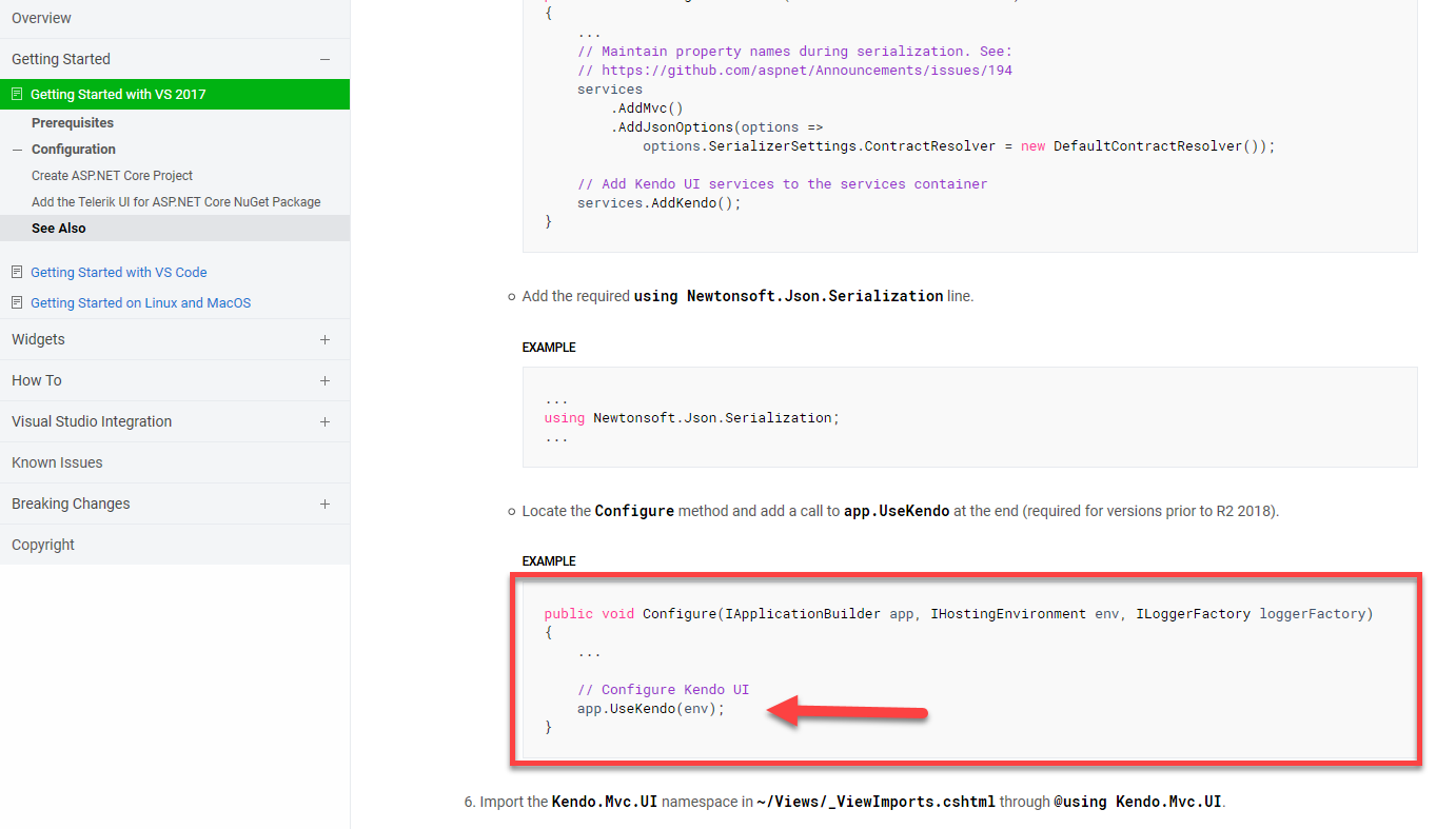 "Locate the Configure method and add a call to app.UseKendo at the end (required for versions prior to R2 2018)."