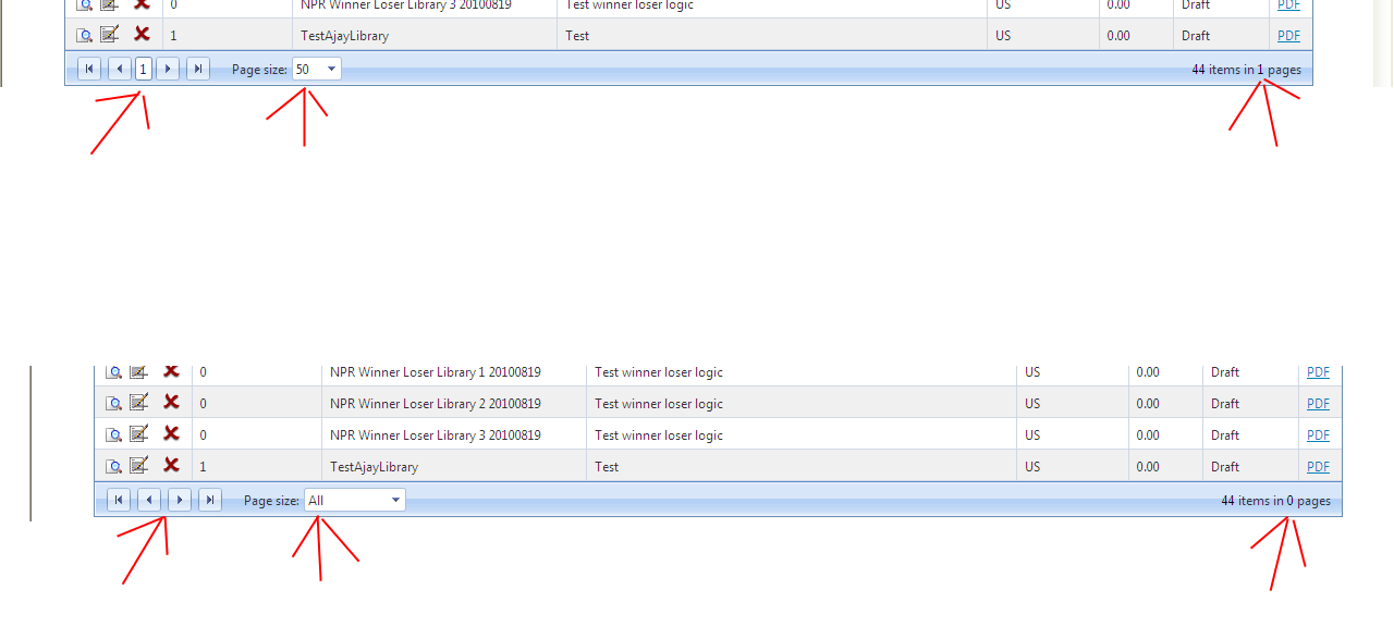 But when I sellect All, I can see 1 Page. (with left bottom button "|<" "<" ">" ">|", and at right bottom "44 items in 0 pages")