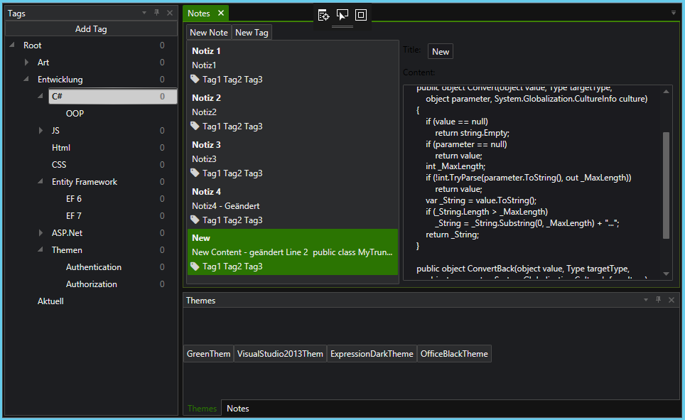 01.namespace Notizen {02. using System;03. using System.Collections.Generic;04. using Caliburn.Micro;05. using System.ComponentModel.Composition.Hosting;06. using System.Linq;07. using System.ComponentModel.Composition;08. using System.Windows;09. using Telerik.Windows.Controls;10. public class AppBootstrapper : BootstrapperBase {11. 12. private CompositionContainer container;13. 14. public AppBootstrapper()15. {16. Initialize();17. }18. 19. protected override void Configure()20. {21. container = new CompositionContainer(22. new AggregateCatalog(AssemblySource.Instance.Select(x => new AssemblyCatalog(x)))23. );24. 25. var batch = new CompositionBatch();26. 27. batch.AddExportedValue<IWindowManager>(new WindowManager());28. //batch.AddExportedValue<IWindowManager>(new TelerikWindowManager());29. batch.AddExportedValue<IEventAggregator>(new EventAggregator());30. batch.AddExportedValue(container);31. 32. // This is essential to enable Telerik's conventions33. TelerikExtensions.TelerikConventions.Install();34. 35. GreenPalette.LoadPreset(GreenPalette.ColorVariation.Dark);36. //StyleManager.ApplicationTheme = ThemeManager.FromName("Expression_Dark");37. 38. container.Compose(batch);39. }40. 41. protected override object GetInstance(Type serviceType, string key)42. {43. string contract = string.IsNullOrEmpty(key) ? AttributedModelServices.GetContractName(serviceType) : key;44. var exports = container.GetExportedValues<object>(contract);45. 46. if (exports.Any())47. return exports.First();48. 49. throw new Exception(string.Format("Could not locate any instances of contract {0}.", contract));50. }51. 52. protected override IEnumerable<object> GetAllInstances(Type serviceType)53. {54. return container.GetExportedValues<object>(AttributedModelServices.GetContractName(serviceType));55. }56. 57. protected override void BuildUp(object instance)58. {59. container.SatisfyImportsOnce(instance);60. }61. 62. protected override void OnStartup(object sender, StartupEventArgs e)63. {64. DisplayRootViewFor<IShell>();65. }66. 67. }68.}tagsView.xaml