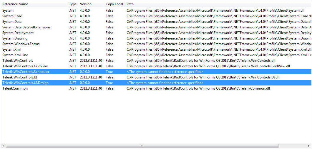 <ItemGroup> <ProjectReference Include="..\..\RadControls\RadControlsUI.Design\Telerik.WinControls.UI.Design.csproj"> <Project>{47E6BA89-8E32-4BE0-BACA-E1D1A650766D}</Project> <Name>Telerik.WinControls.UI.Design</Name> </ProjectReference> <ProjectReference Include="..\..\RadControls\RadScheduler\Telerik.WinControls.Scheduler.csproj"> <Project>{72DCC7B6-6747-4DEE-B810-B5B02859E1D1}</Project> <Name>Telerik.WinControls.Scheduler</Name> </ProjectReference></ItemGroup>Yes, usually when we send sample project, the client needs to correct the references to the Telerik dlls. This is needed because in some cases we use a developer environment to create and test the samples and in this case we use project references. All you need to do on your end is delete the missing references and add them again via the "Add Reference..." dialog of Visual Studio.