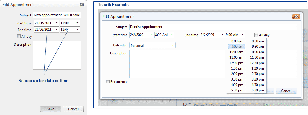 <telerik:RadScriptManager ID="RadScriptManager" runat="server"></telerik:RadScriptManager><div> <telerik:RadAjaxPanel ID="RadAjaxPanel1" runat="server" Height="200px" Width="300px"> <telerik:RadScheduler ID="RadScheduler1" runat="server" DataDescriptionField="Description" DataEndField="EndTime" DataKeyField="EventsID" DataSourceID="SqlDataSource1" DataStartField="StartTime" DataSubjectField="Subject"> </telerik:RadScheduler> </telerik:RadAjaxPanel> <asp:SqlDataSource ID="SqlDataSource1" runat="server" ConnectionString="<%$ ConnectionStrings:PenDataConnectionString %>" SelectCommand="SELECT * FROM [Events]"></asp:SqlDataSource></div>9 Answers, 1 is accepted