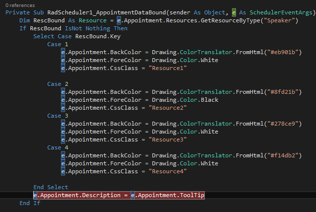 Ive added in the designer code the DataDescriptionField and also in the AppointmentDataBound to assign the "Description" but it never populates in the page when I run it. The Description was populating fine, up until I used the AppointmentDatabound to set the resource styles.