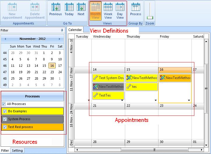 public Predicate<IAppointment> FilterValue { get { return Filter; } } public bool Filter(IAppointment appt) { if (SelectedProcess == null && !SelectAllProcesses) return false; if (SelectAllProcesses) return true; AppointmentBase app = appt as AppointmentBase; //Custom Appointment return app != null && FilterByProcess(app); } public bool FilterByProcess(DZNEAppointmentBase app) { bool isFiltered = false; isFiltered = this.CheckedProcesses.Where(s => s.ProcessID.Equals(app.Process.ProcessID)).FirstOrDefault() != null; return isFiltered; }Filtering Scenario:
