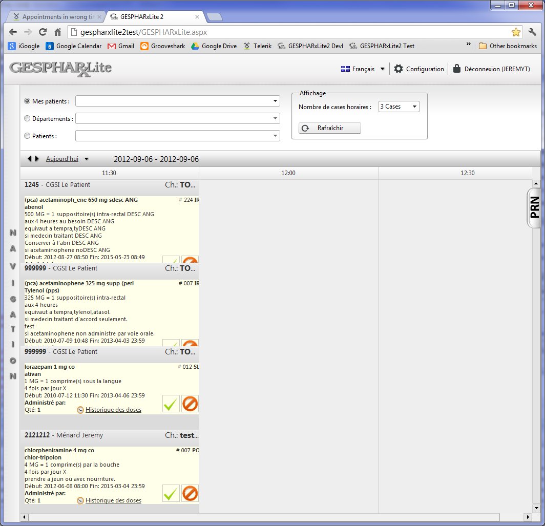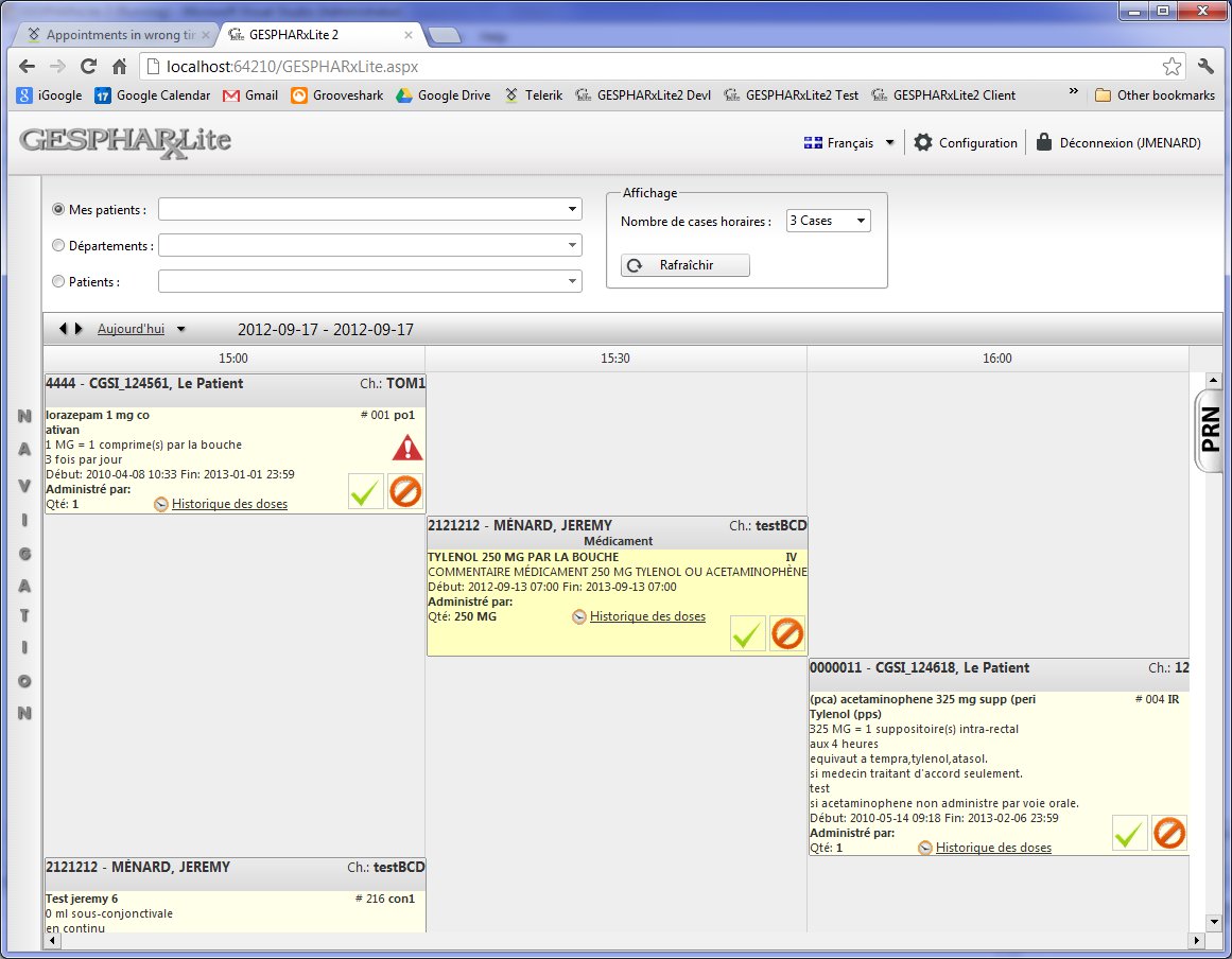 <telerik:RadScheduler runat="server" ID="scListeDoses" SelectedView="TimelineView" DataKeyField="NoAutoOrdo" DataSubjectField="PatiNoauto" DataStartField="AdminDateTime" DataEndField="AdminDateTime" OverflowBehavior="Scroll" OnNavigationComplete="ListeDoses_NavigationComplete" ColumnWidth="350px" CustomAttributeNames="Time, Quantite, NomMedicament, NomPatient, PrenomPatient, Chambre, NumeroDossier, Numero, VoieAffichage, Synonyme, LignePoso1, LignePoso2, LignePoso3, LignePoso4, LignePoso5, LignePoso6, LignePoso7, DateHeureDebut, DateHeureFin, TexteCommun, NoAuto, AdminDateTime, Format,Index, NoAutoOrdo, IsAdministre, UsagerAdmin,CommentaireAdmin, QuantiteAdmin, Canceled, Groupe,PathImageCyto, NoAutoPres, TypePres, TypePresDesc " AllowDelete="False" AllowInsert="False" AllowEdit="False" EnableAdvancedForm="False" EnableRecurrenceSupport="False" TimeLabelRowSpan="1" Height="100%" RowHeight="100%" AppointmentStyleMode="Default" OnAppointmentDataBound="scListeDoses_AppointmentDataBound"> <AdvancedForm Modal="true" /> <AppointmentTemplate> <div style="height: auto"> <div class="FADMEnteteCedule"> <div class="fecPatient nowrap"> <span class="FADMTextGras"> <%#Eval("NumeroDossier")%> - </span> <span class="FADMTextGras"> <%#Eval("NomPatient")%>, </span> <span class="FADMTextGras"> <%#Eval("PrenomPatient")%> </span> </div> <div class="fecChambre nowrap"> <telerik:RadCodeBlock runat="server"> <span class="FADMText Tag6052"> <%=GetMessageEx(6052).Texte%> </span> </telerik:RadCodeBlock> <span class="FADMTextGras"> <%#Eval("Chambre")%></span> </div> <div class="spacer"> </div> <div class="FADMTextGras" style="float:left; height:50%; text-align:center; width:100%"> <%# Eval("TypePresDesc") %></div> </div> <div class="FADMCorpsCedule"> <input type="hidden" name="isAdministre" value="<%# Eval("IsAdministre") %>" /> <input type="hidden" name="Canceled" value="<%# Eval("Canceled") %>" /> <input type="hidden" name="TypePres" value="<%# Eval("TypePres") %>" /> <img src="<%#Eval("PathImageCyto")%>" style="position: absolute; right: 2px; bottom: 50px; z-index: 10" height="26" /> <div class="FADMTextGras" style="float: left;"> <%# Eval("NomMedicament") %></div> <div style="float: right; padding-right:10px;"> <span id="spanNumeroOrdo" class="FADMText" style="<%# IIf((trim(Eval("Numero")) <> Nothing), "", "display:none")%>"> # <%# Eval("Numero") %></span> <span class="FADMTextGras"> <%# Eval("VoieAffichage") %></span> </div> <div class="spacer"> </div> <div class="FADMTextGras"> <%# Eval("Synonyme") %></div> <div class="FADMText"> <%# Eval("LignePoso1") %></div> <div class="FADMText"> <%# Eval("LignePoso2") %></div> <div class="FADMText"> <%#Eval("LignePoso3")%></div> <div class="FADMText"> <%#Eval("LignePoso4")%></div> <div class="FADMText"> <%#Eval("LignePoso5")%></div> <div class="FADMText"> <%#Eval("LignePoso6")%></div> <div class="FADMText"> <%#Eval("LignePoso7")%></div> <div> <telerik:RadCodeBlock ID="RadCodeBlock9" runat="server"> <span class="FADMText Tag6054"> <%=GetMessageEx(6054).Texte%> </span> <span class="FADMText"> <%#Eval("DateHeureDebut")%></span> <span class="FADMText Tag6055"> <%=GetMessageEx(6055).Texte%> </span> <span class="FADMText"> <%#Eval("DateHeureFin")%></span> </telerik:RadCodeBlock> </div> <telerik:RadCodeBlock ID="RadCodeBlock5" runat="server"> <span class="FADMTextGras"> <%=GetMessageEx(6398).Texte%>: </span> </telerik:RadCodeBlock> <div> <span class="FADMText"> <%#Eval("UsagerAdmin")%> </span> <span class="FADMText"> <%#Eval("TexteCommun")%> </span> </div> <div> <telerik:RadCodeBlock ID="RadQteLabel" runat="server"> <span class="FADMText Tag6053" style="<%# IIf((trim(Eval("Quantite")) <> Nothing), "", "display:none")%>"> <%=GetMessageEx(1468).Texte%>: </span> </telerik:RadCodeBlock> <span id="spanQte" class="FADMTextGras" style="margin-right: 70px;"> <%#Eval("Quantite")%></span> <telerik:RadCodeBlock ID="RadCodeBlock8" runat="server"> <a href="javascript:void(0)" onclick="VoirHistorique(<%# Eval("NoAutoOrdo") %>, <%# Eval("NoAutoPres") %>);" class="imageLink"> <span style="background-image: url('Images/historique.gif')"> <!-- --> </span> <%=GetMessageEx(6660).Texte%> </a> </telerik:RadCodeBlock> </div> <div class="fccButtons"> <span class="imageButton" style="display: inline-block; width: 32px; height: 32px" onclick="AdministrationMedic(<%# Eval("Index") %>, false);"> <img class="adminButton" src="Images/Administre.gif" alt="Administré" height="32" style="margin: 0px" /> </span> <span class="imageButton" style="display: inline-block; width: 32px; height: 32px" onclick="AdministrationMedic(<%# Eval("Index") %> ,true);"> <img class="adminButton" src="Images/NonAdmin.gif" alt="Non-Administré" height="32" style="margin: 0px" /> </span> </div> </div> </div> </AppointmentTemplate> <TimelineView UserSelectable="false" NumberOfSlots="4" SlotDuration="00:30:00" ReadOnly="True" ShowResourceHeaders="True" ShowInsertArea="true" TimeLabelSpan="1" ColumnHeaderDateFormat="HH:mm" GroupingDirection="Vertical" HeaderDateFormat="yyyy-MM-dd" /> <DayView UserSelectable="False" /> <WeekView UserSelectable="false" /> <MonthView UserSelectable="false" /> <TimeSlotContextMenuSettings EnableDefault="false" /> <AppointmentContextMenuSettings EnableDefault="false" /> </telerik:RadScheduler>