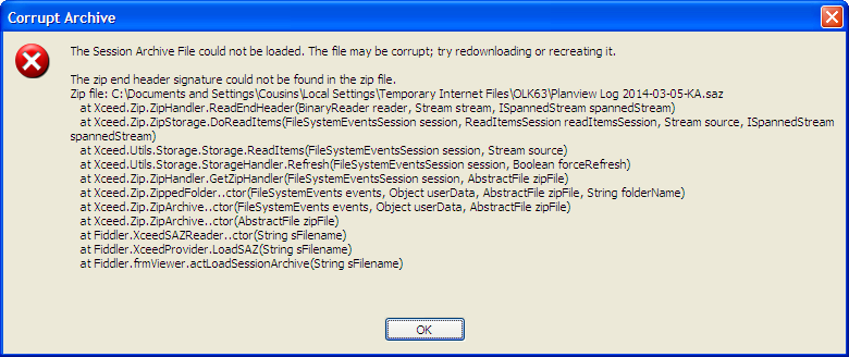 I have a coworker who sends me fiddler logs from their session to help them diagnose the issue. When I attempt to open the file I see the error in the attached image but when opening the file on coworker's computer there is no problem. The user sends me the fiddler log via e-mail. Any help would be appreciated.