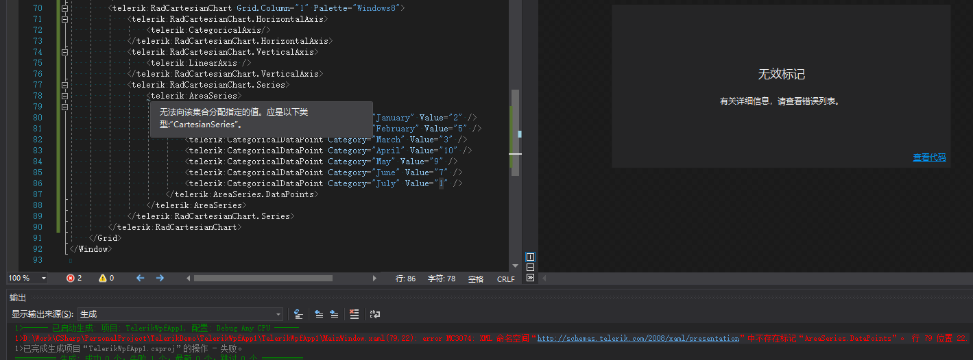 "D:\Work\CSharp\PersonalProject\TelerikDemo\TelerikWpfApp1\TelerikWpfApp1\MainWindow.xaml(79,22): error MC3074: XML 命名空间“http://schemas.telerik.com/2008/xaml/presentation”中不存在标记“AreaSeries.DataPoints”。 行 79 位置 22."