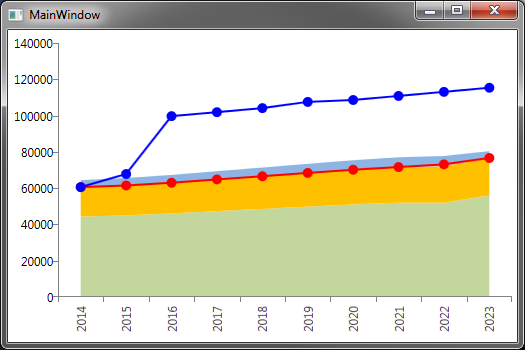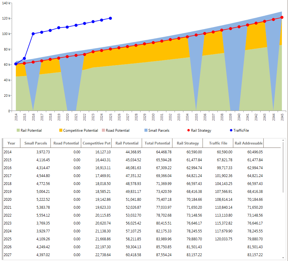 <telerik:RadCartesianChart x:Name="chartFromPort" Margin="5" > <telerik:RadCartesianChart.Behaviors> <telerik:ChartTooltipBehavior HorizontalOffset="-6" VerticalOffset="-49" /> </telerik:RadCartesianChart.Behaviors> <telerik:RadCartesianChart.TooltipTemplate> <DataTemplate> <Grid> <Path Data="M-1236,-441 L-1180,-441 -1180,-424 -1228,-424 -1230.5,-420 -1233,-424 -1236,-424 z" Stretch="Fill" Fill="White" Stroke="Gray" StrokeThickness="1" /> <TextBlock Text="{Binding Value, StringFormat='N0'}" Margin="4,3,4,9" FontFamily="Segoe UI" /> </Grid> </DataTemplate> </telerik:RadCartesianChart.TooltipTemplate> <telerik:RadCartesianChart.Resources> <DataTemplate x:Key="StrategyTemplate"> <Ellipse Height="10" Width="10" Fill="Red" /> </DataTemplate> <DataTemplate x:Key="TrafficFileTemplate"> <Ellipse Height="10" Width="10" Fill="Blue" /> </DataTemplate> </telerik:RadCartesianChart.Resources> <telerik:RadCartesianChart.HorizontalAxis> <telerik:CategoricalAxis LabelFitMode="Rotate" LabelRotationAngle="270" PlotMode="BetweenTicks" /> </telerik:RadCartesianChart.HorizontalAxis> <telerik:RadCartesianChart.VerticalAxis> <telerik:LinearAxis Minimum="0" > <telerik:LinearAxis.LabelTemplate> <DataTemplate> <TextBlock Text="{Binding Converter={StaticResource LabelFormatConverter}}"/> </DataTemplate> </telerik:LinearAxis.LabelTemplate> </telerik:LinearAxis> </telerik:RadCartesianChart.VerticalAxis> <telerik:RadCartesianChart.Series> <telerik:AreaSeries ItemsSource="{Binding MarketShareVolumesFromPort}" CategoryBinding="Year" ValueBinding="RailPotential" CombineMode="Stack" > <telerik:AreaSeries.LegendSettings> <telerik:SeriesLegendSettings Title="Rail Potential" /> </telerik:AreaSeries.LegendSettings> <telerik:AreaSeries.AreaShapeStyle> <Style TargetType="Path"> <Setter Property="Fill" Value="#FFC3D69B"/> </Style> </telerik:AreaSeries.AreaShapeStyle> </telerik:AreaSeries> <telerik:AreaSeries ItemsSource="{Binding MarketShareVolumesFromPort}" CategoryBinding="Year" ValueBinding="Competitive" CombineMode="Stack" > <telerik:AreaSeries.LegendSettings> <telerik:SeriesLegendSettings Title="Competitive Potential" /> </telerik:AreaSeries.LegendSettings> <telerik:AreaSeries.AreaShapeStyle> <Style TargetType="Path"> <Setter Property="Fill" Value="#FFFFC000"/> </Style> </telerik:AreaSeries.AreaShapeStyle> </telerik:AreaSeries> <telerik:AreaSeries ItemsSource="{Binding MarketShareVolumesFromPort}" CategoryBinding="Year" ValueBinding="RoadFriendly" CombineMode="Stack" > <telerik:AreaSeries.LegendSettings> <telerik:SeriesLegendSettings Title="Road Potential" /> </telerik:AreaSeries.LegendSettings> <telerik:AreaSeries.AreaShapeStyle> <Style TargetType="Path"> <Setter Property="Fill" Value="#FFE6B9B8"/> </Style> </telerik:AreaSeries.AreaShapeStyle> </telerik:AreaSeries> <telerik:AreaSeries ItemsSource="{Binding MarketShareVolumesFromPort}" CategoryBinding="Year" ValueBinding="SmallParcelLimit" CombineMode="Stack" > <telerik:AreaSeries.LegendSettings> <telerik:SeriesLegendSettings Title="Small Parcels" /> </telerik:AreaSeries.LegendSettings> <telerik:AreaSeries.AreaShapeStyle> <Style TargetType="Path"> <Setter Property="Fill" Value="#FF8EB4E3"/> </Style> </telerik:AreaSeries.AreaShapeStyle> </telerik:AreaSeries> <telerik:LineSeries ItemsSource="{Binding MarketShareVolumesFromPort}" CategoryBinding="Year" ValueBinding="RailStrategy" CombineMode="None" PointTemplate="{StaticResource StrategyTemplate}" > <telerik:LineSeries.LegendSettings> <telerik:SeriesLegendSettings Title="Rail Strategy" MarkerGeometry="{StaticResource EllipseGeometry1}" /> </telerik:LineSeries.LegendSettings> <telerik:LineSeries.StrokeShapeStyle> <Style TargetType="Path"> <Setter Property="Stroke" Value="Red"/> <Setter Property="StrokeThickness" Value="2"/> </Style> </telerik:LineSeries.StrokeShapeStyle> </telerik:LineSeries> <telerik:LineSeries ItemsSource="{Binding MarketShareVolumesFromPort}" CategoryBinding="Year" ValueBinding="PlannedRail" CombineMode="None" PointTemplate="{StaticResource TrafficFileTemplate}" > <telerik:LineSeries.LegendSettings> <telerik:SeriesLegendSettings Title="TrafficFile" MarkerGeometry="{StaticResource EllipseGeometry1}" /> </telerik:LineSeries.LegendSettings> <telerik:LineSeries.StrokeShapeStyle> <Style TargetType="Path"> <Setter Property="Stroke" Value="Blue"/> <Setter Property="StrokeThickness" Value="2"/> </Style> </telerik:LineSeries.StrokeShapeStyle> </telerik:LineSeries> </telerik:RadCartesianChart.Series></telerik:RadCartesianChart>And here is the gridview section: