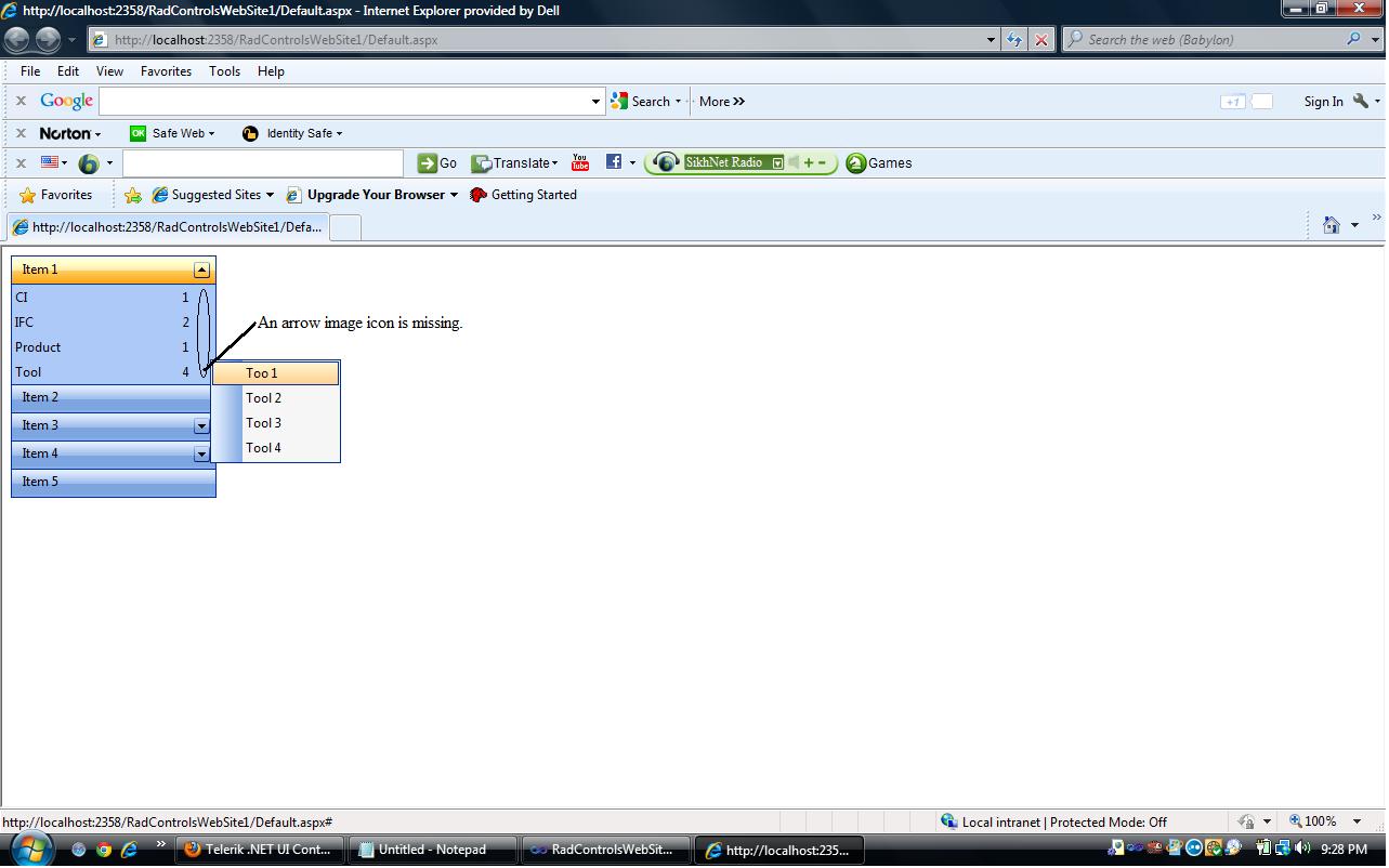 My requirement is to dynamically bind a RadMenu inside the RadPanelBar. I am able to achieve this, but the problem here is if I am trying to create the ItemTemplate for each RadMenuItem inside the RadMenu then the arrow image is getting disappeared if a menu item has submenu items. It will be great if you can suggest me how I can achieve this. I have attached the sample code snippets as well as the screenshot.