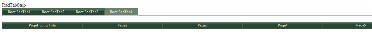 <%@ Control Language="vb" AutoEventWireup="false" CodeBehind="TabControl.ascx.vb" Inherits="CustomSkin_Hew.TabControl" %><telerik:RadTabStrip ID="RadAjaxTabStrip1" runat="server" AutoPostBack="false" Align="Left" Orientation="HorizontalTop" ShowBaseLine="true" Width="100%"> <Tabs> <telerik:RadTab Text="Page1 Long Title" runat="server" Width="20%"> </telerik:RadTab> <telerik:RadTab Text="Page2" runat="server" Width="20%"> </telerik:RadTab> <telerik:RadTab Text="Page3" runat="server" Width="20%"> </telerik:RadTab> <telerik:RadTab Text="Page4" runat="server" Width="20%"> </telerik:RadTab> <telerik:RadTab Text="Page5" runat="server" Width="19%"> </telerik:RadTab> </Tabs></telerik:RadTabStrip>ASPX code: