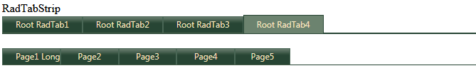 <tr> <td> <asp:Label ID="Label2" runat="server" Text="RadTabStrip"></asp:Label> </td></tr><tr> <td> <telerik:RadTabStrip ID="RadTabStrip1" runat="server" SelectedIndex="3" Align="left" Orientation="HorizontalTop" ShowBaseLine="true" TabIndex="-1"> <Tabs> <telerik:RadTab runat="server" Text="Root RadTab1"> <Tabs> <telerik:RadTab runat="server" Text="Child RadTab 1"> </telerik:RadTab> </Tabs> </telerik:RadTab> <telerik:RadTab runat="server" Text="Root RadTab2"> <Tabs> <telerik:RadTab runat="server" Text="Child RadTab 2"> </telerik:RadTab> </Tabs> </telerik:RadTab> <telerik:RadTab runat="server" Text="Root RadTab3"> </telerik:RadTab> <telerik:RadTab runat="server" Text="Root RadTab4" Selected="True"> </telerik:RadTab> </Tabs> </telerik:RadTabStrip> </td></tr><tr> <td> </td></tr><tr> <td> <rad:TabControl runat="server" ID="objTab"></rad:TabControl> </td></tr>