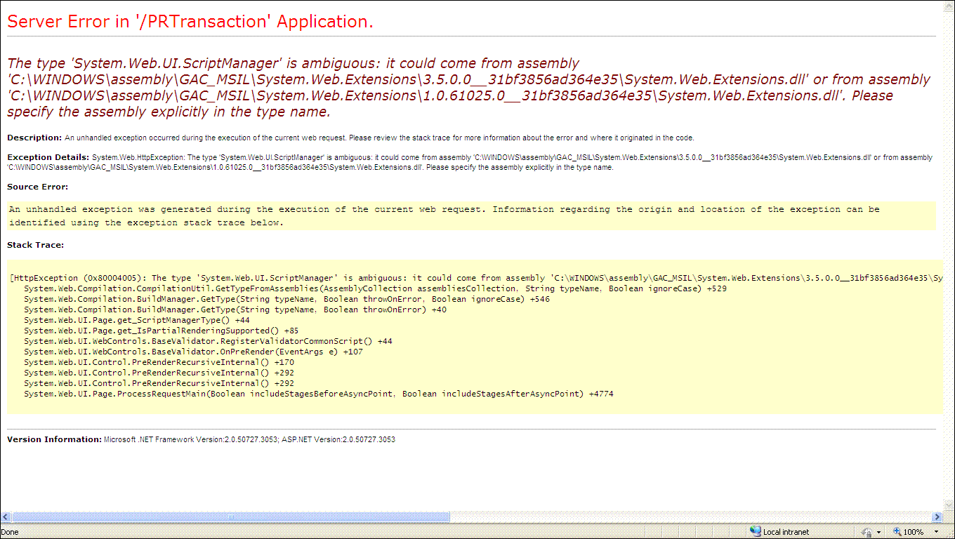 <?xml version="1.0"?><configuration xmlns="http://schemas.microsoft.com/.NetConfiguration/v2.0"> <configSections> <sectionGroup name="system.web.extensions" type="System.Web.Configuration.SystemWebExtensionsSectionGroup, System.Web.Extensions, Version=3.5.0.0, Culture=neutral, PublicKeyToken=31bf3856ad364e35"> <sectionGroup name="scripting" type="System.Web.Configuration.ScriptingSectionGroup, System.Web.Extensions, Version=3.5.0.0, Culture=neutral, PublicKeyToken=31bf3856ad364e35"> <section name="scriptResourceHandler" type="System.Web.Configuration.ScriptingScriptResourceHandlerSection, System.Web.Extensions, Version=3.5.0.0, Culture=neutral, PublicKeyToken=31bf3856ad364e35" requirePermission="false" allowDefinition="MachineToApplication"/> <sectionGroup name="webServices" type="System.Web.Configuration.ScriptingWebServicesSectionGroup, System.Web.Extensions, Version=3.5.0.0, Culture=neutral, PublicKeyToken=31bf3856ad364e35"> <section name="jsonSerialization" type="System.Web.Configuration.ScriptingJsonSerializationSection, System.Web.Extensions, Version=3.5.0.0, Culture=neutral, PublicKeyToken=31bf3856ad364e35" requirePermission="false" allowDefinition="Everywhere"/> <section name="profileService" type="System.Web.Configuration.ScriptingProfileServiceSection, System.Web.Extensions, Version=3.5.0.0, Culture=neutral, PublicKeyToken=31bf3856ad364e35" requirePermission="false" allowDefinition="MachineToApplication"/> <section name="authenticationService" type="System.Web.Configuration.ScriptingAuthenticationServiceSection, System.Web.Extensions, Version=3.5.0.0, Culture=neutral, PublicKeyToken=31bf3856ad364e35" requirePermission="false" allowDefinition="MachineToApplication"/> </sectionGroup> </sectionGroup> </sectionGroup> </configSections> <system.web> <pages> <controls> <add tagPrefix="asp" namespace="System.Web.UI" assembly="System.Web.Extensions, Version=3.5.0.0, Culture=neutral, PublicKeyToken=31BF3856AD364E35"/> <add tagPrefix="asp" namespace="System.Web.UI.WebControls" assembly="System.Web.Extensions, Version=3.5.0.0, Culture=neutral, PublicKeyToken=31BF3856AD364E35"/> <add tagPrefix="telerik" namespace="Telerik.Web.UI" assembly="Telerik.Web.UI"/> <add tagPrefix="TBSUC" tagName="LeftPane" src="~/Shared/LeftSidePane.ascx"/> <add tagPrefix="TBFA" tagName="FileAttach" src="~/Views/Shared/FileAttachment.ascx"/> <add tagPrefix="TBSUCTictet" tagName="TicketLeftPane" src="~/Shared/TicketLeftSidePane.ascx"/> <add tagPrefix="TBChange" tagName="ChangeLeftPane" src="~/Shared/ChangeLeftSidePane.ascx"/> </controls> </pages> <identity impersonate="true"/> <siteMap> <providers> <add name="mastermap" type="System.Web.XmlSiteMapProvider" siteMapFile="Web.sitemap"/> <add name="transactionmap" type="System.Web.XmlSiteMapProvider" siteMapFile="Web2.sitemap"/> </providers> </siteMap> <!-- Set compilation debug="true" to insert debugging symbols into the compiled page. Because this affects performance, set this value to true only during development. --> <compilation debug="true"> <assemblies> <add assembly="System.Web.Extensions, Version=3.5.0.0, Culture=neutral, PublicKeyToken=31bf3856ad364e35"/> <add assembly="System.Web.Extensions.Design, Version=3.5.0.0, Culture=neutral, PublicKeyToken=31BF3856AD364E35"/> <add assembly="System.Design, Version=2.0.0.0, Culture=neutral, PublicKeyToken=B03F5F7F11D50A3A"/> <add assembly="System.Windows.Forms, Version=2.0.0.0, Culture=neutral, PublicKeyToken=B77A5C561934E089"/> <add assembly="System, Version=2.0.0.0, Culture=neutral, PublicKeyToken=B77A5C561934E089"/> <add assembly="System.Web, Version=2.0.0.0, Culture=neutral, PublicKeyToken=B03F5F7F11D50A3A"/> <add assembly="System.Drawing, Version=2.0.0.0, Culture=neutral, PublicKeyToken=B03F5F7F11D50A3A"/> <add assembly="System.Xml, Version=2.0.0.0, Culture=neutral, PublicKeyToken=B77A5C561934E089"/> <add assembly="System.Data, Version=2.0.0.0, Culture=neutral, PublicKeyToken=B77A5C561934E089"/> <add assembly="System.Web.Services, Version=2.0.0.0, Culture=neutral, PublicKeyToken=B03F5F7F11D50A3A"/> <add assembly="CrystalDecisions.CrystalReports.Engine, Version=10.2.3600.0, Culture=neutral, PublicKeyToken=692fbea5521e1304"/> <add assembly="CrystalDecisions.ReportSource, Version=10.2.3600.0, Culture=neutral, PublicKeyToken=692fbea5521e1304"/> <add assembly="CrystalDecisions.Shared, Version=10.2.3600.0, Culture=neutral, PublicKeyToken=692fbea5521e1304"/> <add assembly="CrystalDecisions.Web, Version=10.2.3600.0, Culture=neutral, PublicKeyToken=692fbea5521e1304"/> <add assembly="CrystalDecisions.ReportAppServer.ClientDoc, Version=10.2.3600.0, Culture=neutral, PublicKeyToken=692fbea5521e1304"/> <add assembly="CrystalDecisions.Enterprise.Framework, Version=10.2.3600.0, Culture=neutral, PublicKeyToken=692fbea5521e1304"/> <add assembly="CrystalDecisions.Enterprise.InfoStore, Version=10.2.3600.0, Culture=neutral, PublicKeyToken=692fbea5521e1304"/> <add assembly="System.Web.Extensions, Version=3.5.0.0, Culture=neutral, PublicKeyToken=31BF3856AD364E35"/> <add assembly="System.Web.Extensions, Version=1.0.61025.0, Culture=neutral, PublicKeyToken=31BF3856AD364E35"/></assemblies> </compilation> <httpHandlers> <remove verb="*" path="*.asmx"/> <add verb="*" path="*.asmx" validate="false" type="System.Web.Script.Services.ScriptHandlerFactory, System.Web.Extensions, Version=3.5.0.0, Culture=neutral, PublicKeyToken=31bf3856ad364e35"/> <add verb="*" path="*_AppService.axd" validate="false" type="System.Web.Script.Services.ScriptHandlerFactory, System.Web.Extensions, Version=3.5.0.0, Culture=neutral, PublicKeyToken=31bf3856ad364e35"/> <add verb="GET,HEAD" path="ScriptResource.axd" type="System.Web.Handlers.ScriptResourceHandler, System.Web.Extensions, Version=3.5.0.0, Culture=neutral, PublicKeyToken=31bf3856ad364e35" validate="false"/> <add verb="GET" path="CrystalImageHandler.aspx" type="CrystalDecisions.Web.CrystalImageHandler, CrystalDecisions.Web, Version=10.2.3600.0, Culture=neutral, PublicKeyToken=692fbea5521e1304"/> <add path="Tele
