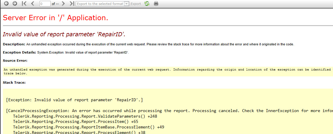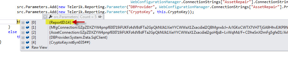 01.protected void Page_Load(object sender, EventArgs e)02. {03. if (!Page.IsPostBack)04. {05. // TEMPORARY!!! Only Use For Development if viewing this page directly!!06. //Session["REPORT_REPAIR_ID"] = 7;07. 08. if (Session["REPORT_REPAIR_ID"] != null)09. {10. TypeReportSource src = new TypeReportSource();11. 12. src.TypeName = "Halliburton.DBS.AssetRepairTracker.Reports.RepairOrder, Halliburton.DBS.AssetRepairTracker";13. 14. src.Parameters.Add(new Telerik.Reporting.Parameter("ReportID", Convert.ToInt32(Session["REPORT_REPAIR_ID"])));15. src.Parameters.Add(new Telerik.Reporting.Parameter("MfgConnection",16. WebConfigurationManager.ConnectionStrings["ManufactureSupport"].ConnectionString));17. src.Parameters.Add(new Telerik.Reporting.Parameter("AssetConnection",18. WebConfigurationManager.ConnectionStrings["AssetRepair"].ConnectionString));19. src.Parameters.Add(new Telerik.Reporting.Parameter("DBProvider", WebConfigurationManager.ConnectionStrings["AssetRepair"].ProviderName));20. src.Parameters.Add(new Telerik.Reporting.Parameter("CryptoKey", this.CryptoKey));21. 22. this.trvReportViewer.ReportSource = src;23. }24. else25. throw new Exception("Bad Redirect");26. }27. }However when the report is initialized, and I peak at the parameter collection, all the parameters are null (or empty). This is causing an invalid parameter value exception when the parameters validate (because I have AllowNull = false)
