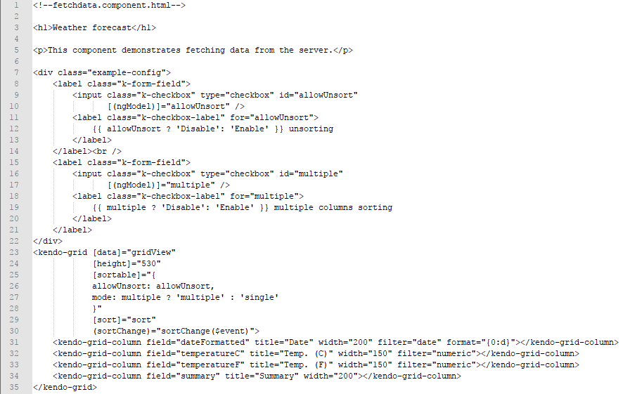 I've been working with a Telerik sortable Grid in an ASP.Net Core 2 Angular 2 SPA, the data I'm attempting to implement a working instance of this with the fetchdata.component that comes with the initial rendering of the Angular 2 SPA. I've been able to load data into the grid but the data only seems to populate after a filter field is activated by mouse click. On initial load the grid will show up empty with 'No records available' under the first column leaving all other non-header data empty.