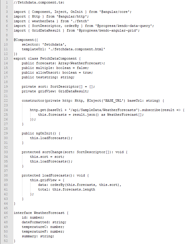 I have noticed that there's an example for data binding OData sources on the Telerik site however the super(null) for northwind.service.ts received an error suggesting that a null value wouldn't be permitted thus I wasn't able to experiment much with the code. Attached below is my attempt so far to code the typescript and html files for the Telerik sorting grid. Again, this gets me as far as the grid receiving data however the initial load is not populating the data. As far as I can tell the OData example implies that I might need to feed a BehaviorSubject array to the gridView but I'm not entirely sure whether that's baked in as a requirement or whether its relevant to an http.get from ASP.Net and Entity Framework. Let me know if you have any suggestions on how this needs to be rearranged or what I'd need to add in order to get this up and running properly. Thank you!