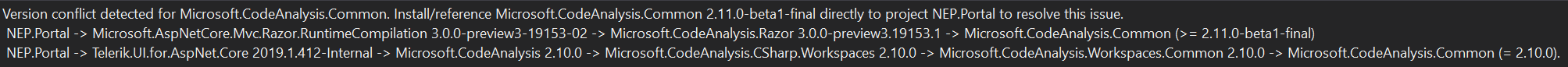 I get an error when trying to add Microsoft.AspNetcore.Mvc.Razor.RuntimeCompilation to my project to re-enable this feature which was removed from the base package. Attached is the error I am receiving.