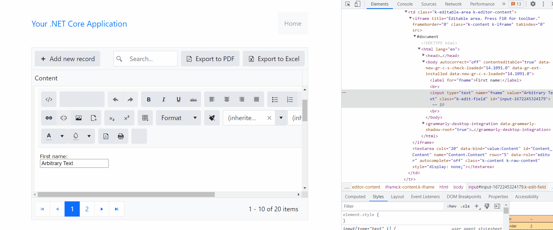 I have an editor (classic mode) I use in an editor template like @(Html.Kendo().EditorFor(m => m.Content) for a grid to create and update HTML content coming from the database that has inputs and selects. When I first load the content to the editor, I have a processEditorInputs() JavaScript function that loops thru all the inputs and selects in the editor's iframe, adds a css class to them, and adds a dblclick event listener so they can be edited via a kendo dialog I have also in my view. Everything is working fine but I have an issue I have not been able to figure out. After the undo action is performed in the editor, either by ctrl+Z or toolbar action, all my inputs in the editor lose their doubleclick binding and therefore cannot be edited again via the dialog. I tried subscribing to the 'Execute' event of the editor to call my processEditorInputs() function again after undo is performed like below: